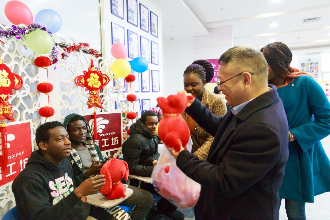与会领导和老师们为每一位国际学生送上狗年吉祥物,与国际学生共进午餐,在温馨的氛围中听国际学生畅谈新春感想,欣赏他们表演歌曲和中国武术。塔吉克斯坦籍2017级商务汉语专业学生AMIROV RUSTAM说“今天,学校领导和老师们不顾假期专程赶到学校与我们一起过中国年,我真的很感动,也很感激。国际家庭大团圆的温馨氛围让这个时候我特别想念自己的家人,想与他们分享在中国过春节的切身感受。这是我从未有过的感觉,这或许是印证了中国古诗‘独在异乡为异客,每逢佳节倍思亲’吧。”