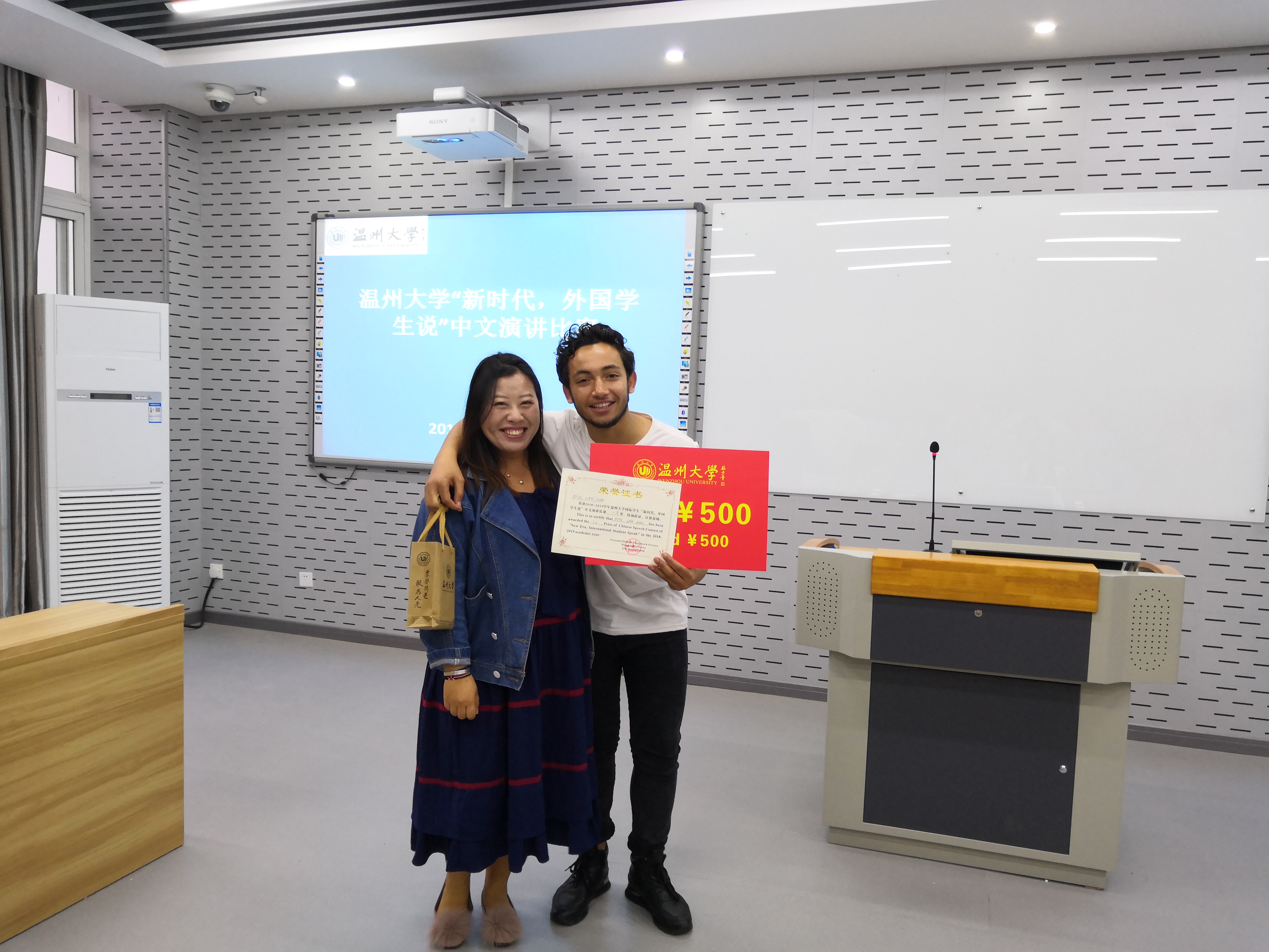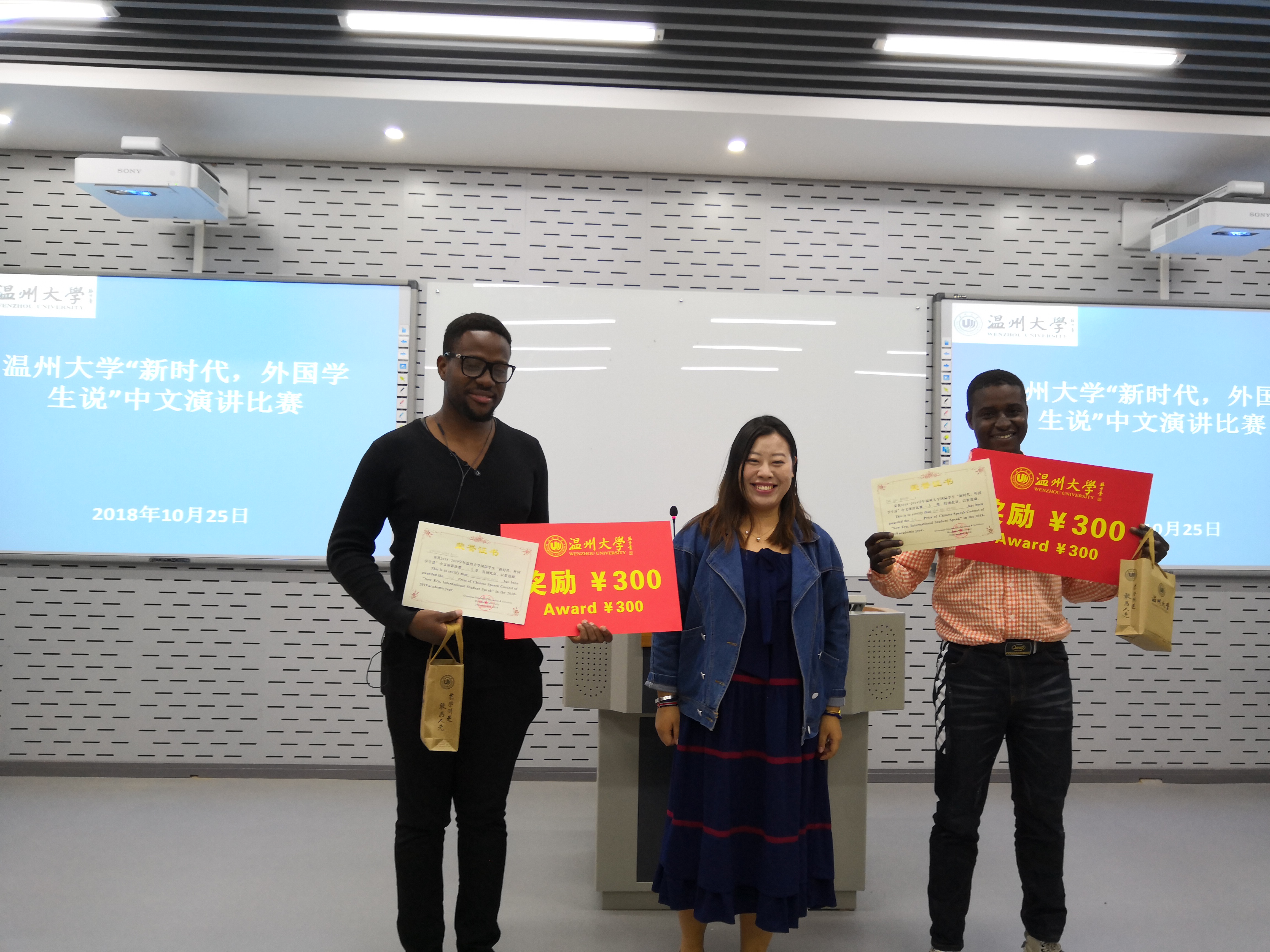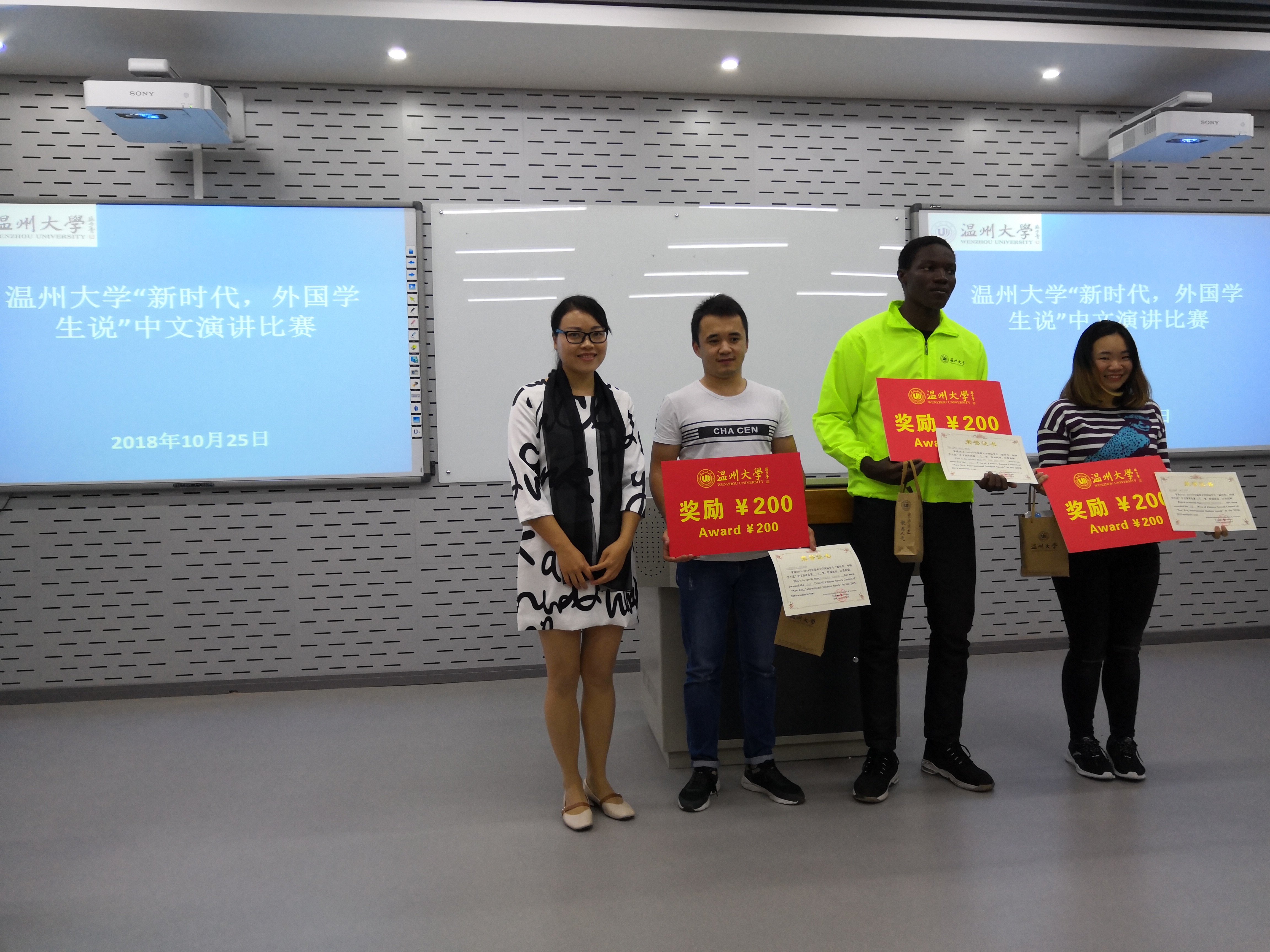演讲比赛以“新时代”为主题,展示国际学生对中国、浙江高端技术制造能力、现代新农业技术、中国传统民俗文化等方面的独特看法,国际学生们一一上台讲述自己的亲身经历。来自乌兹别克斯坦的MAMASOBIROV MIFTOKHIDDIN以在beat365中文官方网站过中秋节为切入点,对比了自己国家的传统节日与中国传统节日,他说在学校吃月饼过中秋节是非常温暖的一件事,让他体会到家的感觉。来自加纳的王汉别出心裁,以一个“来自加纳的小伙子的故事”为主题,向在场师生分享了自己在中国学习、生活的有趣经历,他的演讲诙谐幽默、语言流畅,赢得阵阵掌声。来自塞拉利昂的JENG ABU BAKARR谈到他眼中的中国时说道,中国的科技发展、快捷支付方式、畅通的交通网络和便利的出行方式都让这里的生活变得非常舒适,他期待今后能在中国继续深造,走进更多城市,感受这里的一切。活动最后,评委老师分别为获得一、二、三等奖的学生颁奖。