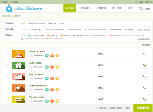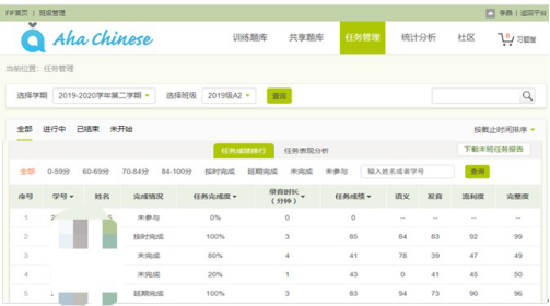 (4)引入口语训练系统,辅助汉语教学。Aha Chinese是一款由外研社联合外研讯飞倾力打造融合最新口语教学理念和尖端语音评估技术的、适配多终端的汉语口语教学与管理系统。老师可以在系统上发布教学任务,学生可以随时随地练习汉语口语。
