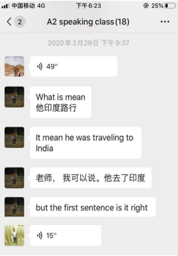 (3)每节课的语音作业发到微信群,大家听后可以互相交流讨论,老师及时答疑,并在课上对学生在口语表达中出现的错误进行纠正。