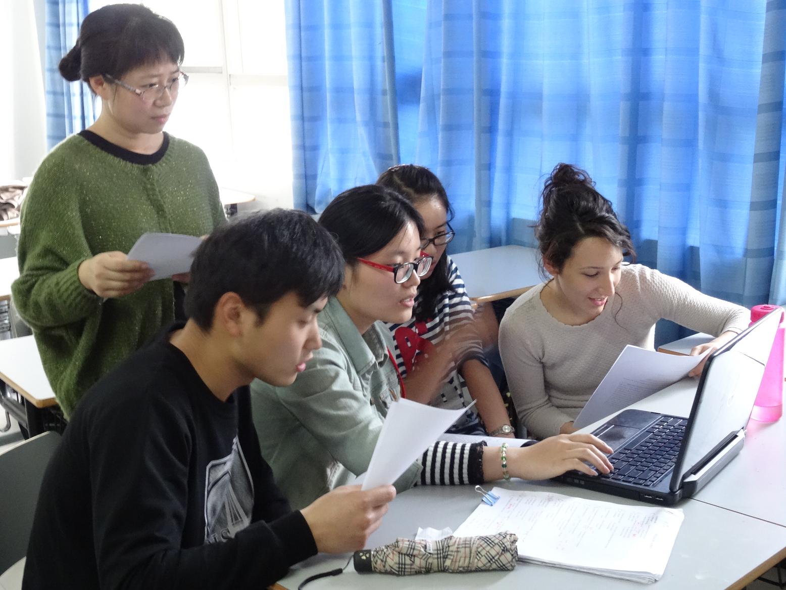 活动开始后,两位主持人——两岸13级学生刘彦夫与华裔美国留学生Alice同学分别用中英文向大家表示了欢迎,并详细介绍了规则。本次英语角以分组进行各类英语游戏形式开展,在主持人的安排下,参与者们分成了四个小组,其中每一小组皆由中国师生与留学生们按比例搭配。首先,各小组成员分别用英语作了自我介绍,组员们对自己的团队有了初步的了解。然后,大家进入第一个游戏环节——短句接龙。主持人分别向每小组第一位成员提供一段英文美句,后依次传接。在经过五位成员的传递后,部分小队得到了有趣的小句,在大家的欢声中,主持人根据句子的完整度评出了冠军小队。之后,是“绕口令”环节。五位积极的参与者来到幻灯前,经过短暂的准备后,在大家的鼓励中朗读了各自的小段。在保证准确发音的前提下,主持人为每位参与者进行计时并决出了优胜者。最后是配音游戏,其中的经典桥段分别出自著名电影《泰坦尼克号》、《冰雪奇缘》、《狮子王》、《神偷奶爸》。每小组分别选出几位成员扮演电影中的角色,并为电影配音。看着他们惟妙惟肖地表演,四位评委惊叹不已。