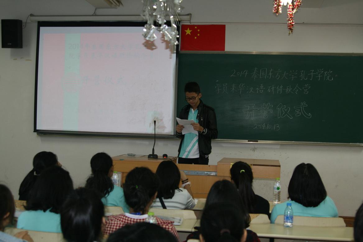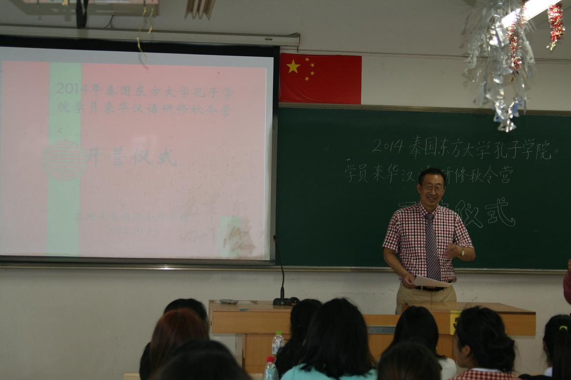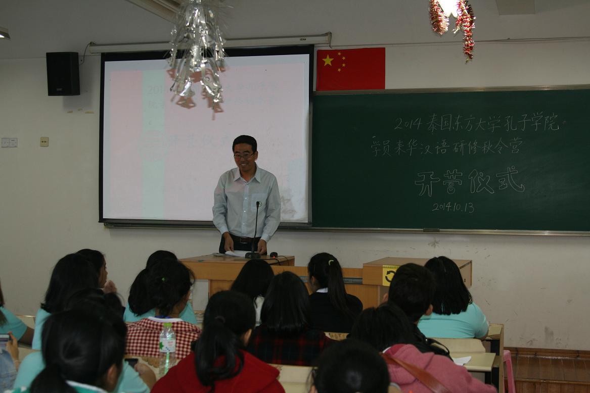 2014年10月13日上午9点,泰国东方大学孔子学院学员来华汉语研修秋令营在南校区9号楼准时开营。国际合作学院院长严晓鹏博士、东方大学孔子学院中方院长陈素云老师出席此次开营仪式,国际合作学院的教师代表以及20位营员共同参加了此次开营仪式。仪式由学院学生科留学生事务主管刘建东老师主持。
