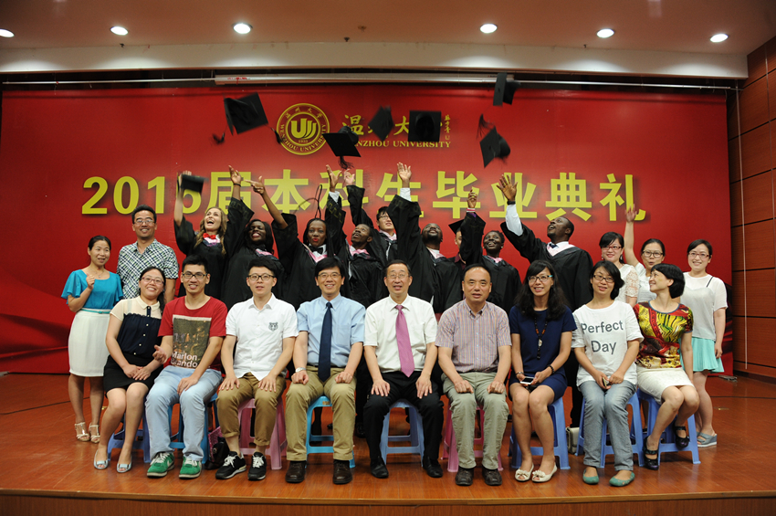 6月18日下午,beat365中文官方网站2015届留学生毕业典礼在岩松堂雁山厅隆重举行。校长蔡袁强教授为留学生毕业生颁发毕业证书和学士学位证书,典礼由国际合作学院副院长陈军主持。