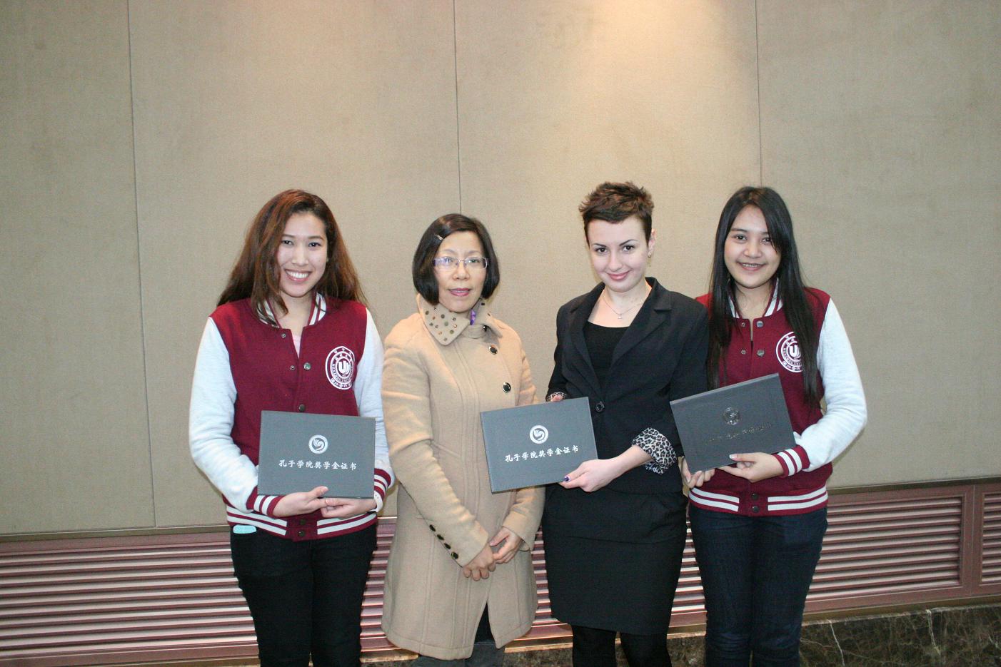 图为外事处处长叶苗颁发孔子学院奖学金证书