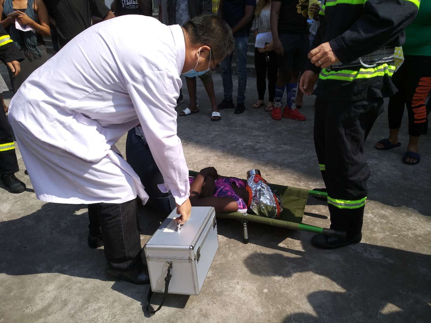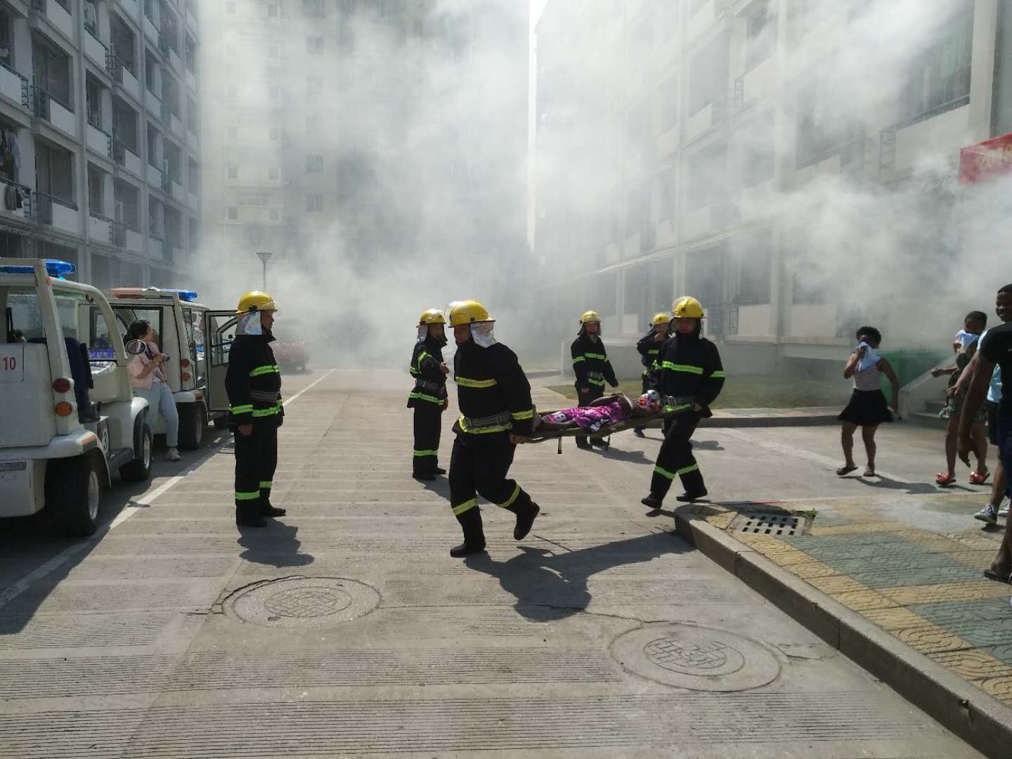 下午2时许,D区1号楼313寝室发生了“火灾”,泰国学生李梦瑶发现后第一时间报警,消防人员紧急出动灭火,并进入火灾现场抢救“伤员”,指导学生疏散逃生。各楼层国际学生助理纷纷加入其中,向逃生学生分发毛巾,引导他们用湿毛巾捂住口鼻,并协助消防员完成疏散任务。随后消防队员向在场国际学生演示如何使用灭火器,学生们纷纷地自告奋勇去体验干粉灭火器的操作方法。