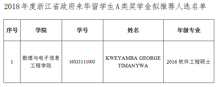 2018年度浙江省政府来华留学生B类奖学金拟推荐人选名单