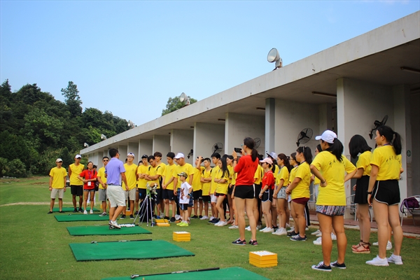 来到练习场地,首先由教练为大家讲解打高尔夫球的基本要领和注意事项,从站姿、握杆、挥杆到击球,营员们仔细观察者教练的一招一式,尝试着去模仿。正式开始练习,按照教练的指导营员们认真地练习,教练在一旁观察,并指导。一次次地练习,很快不少营员开始找到感觉,从碰不到球到挥出精彩的一杆,大家都一致叫好,为队友的进步而喝彩,尽情享受球场上挥杆的快乐与成就感。