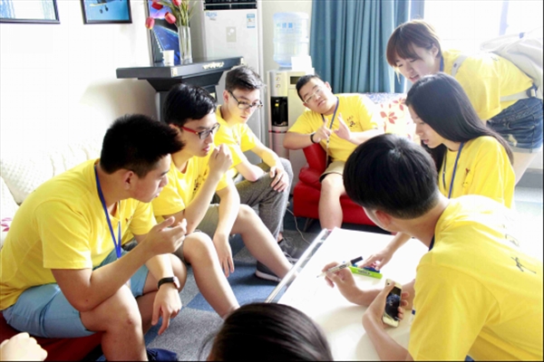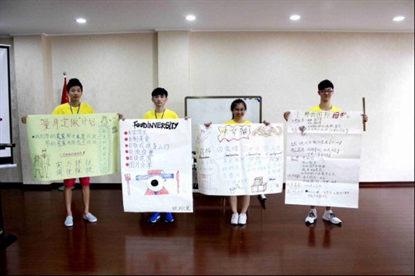 理论知识是实践课程,营员们分为四组,开始了自己的第一次创业设计。一个小时的时间,用一张白纸、几支彩笔勾勒出满脑子的新鲜主意,四队营员设计出了四组各具特色的创业方案:分别是“中华龙开店一条龙服务公司”、“量身定做计划”、“FOODINVERSITY”和“小鲜肉国际相亲网站”。