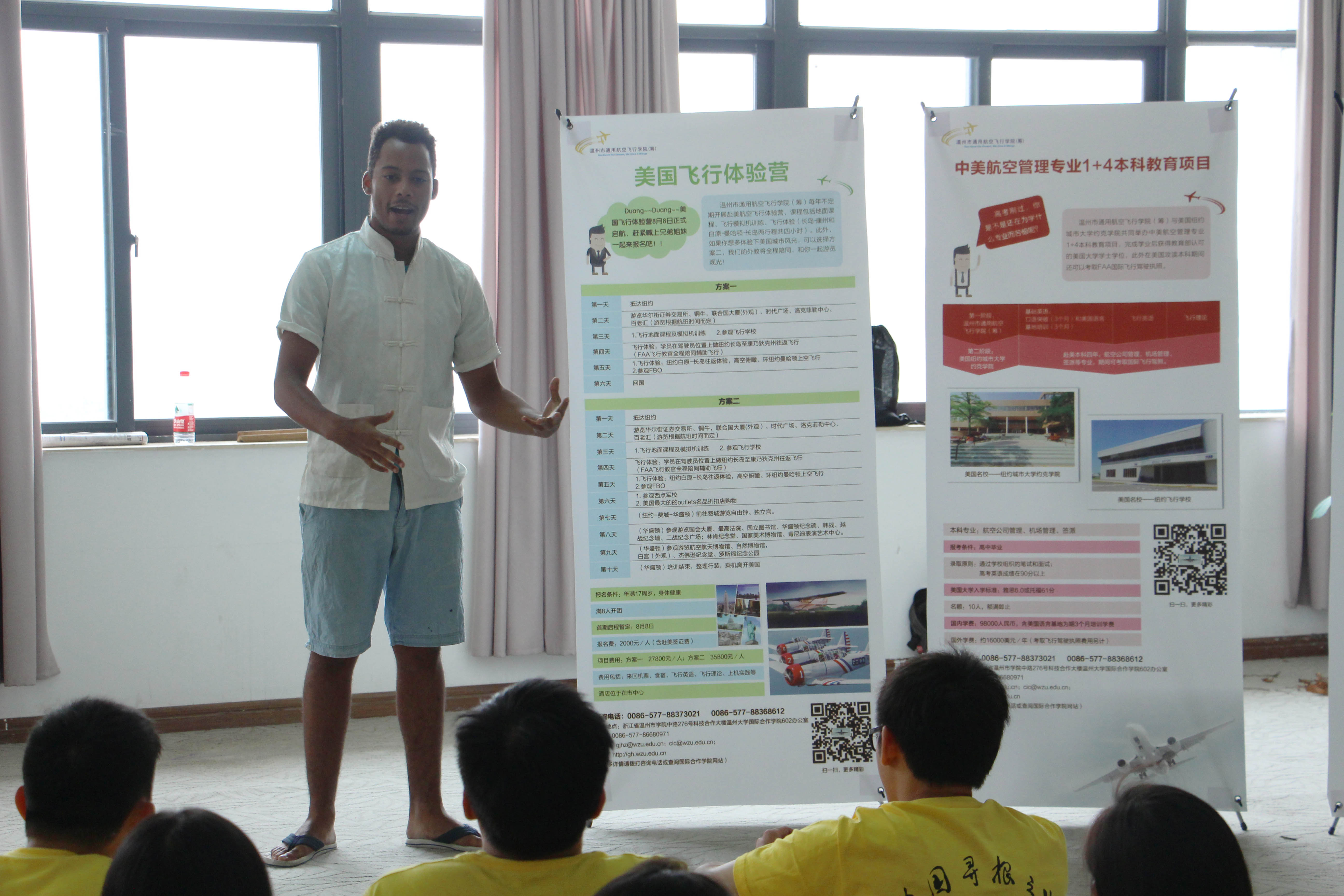 接着包老师介绍道:随着温州通用航空产业的发展,各类航空专业人才将十分紧缺,温州市通用航空学院(筹)积极开拓中美合作航空教育,以中美合作培养的方式开展通用航空飞行员私照、商照培训和飞行技能与学历教育相结合的各种复合型通用航空人才的培养,今后逐步发展成培养的专门机构。然后,通用航空飞行学院(筹)的飞行教官苏中元、徐龙以及飞行英语外教Eli简单介绍了航空专业的培养方案。