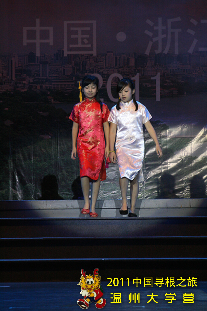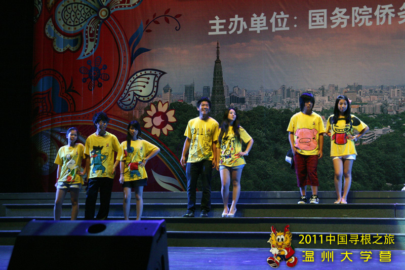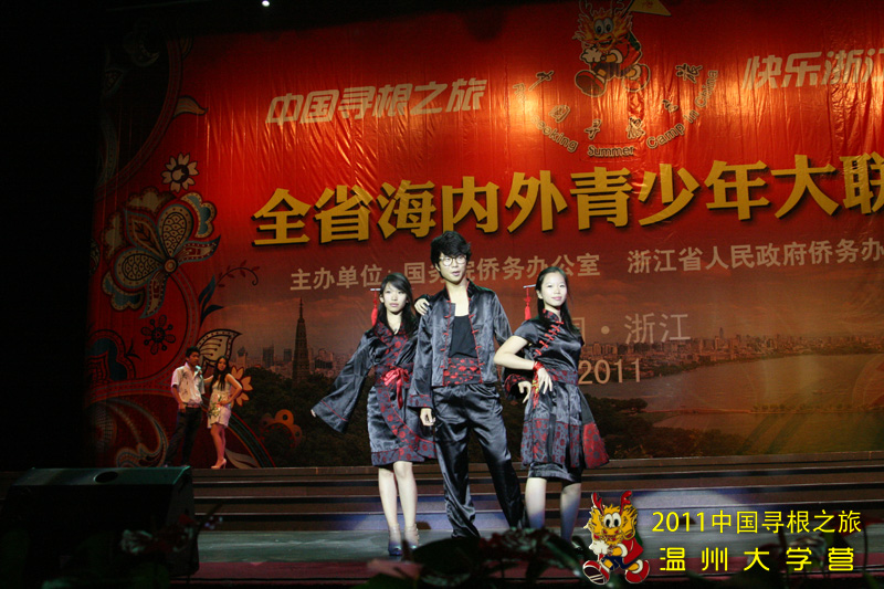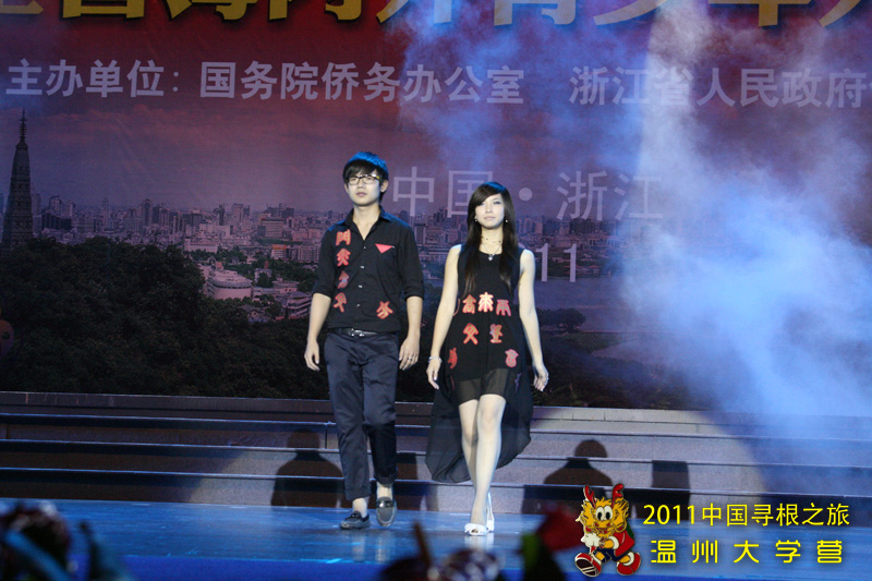 在联欢活动上,温大营员表演的服装走秀节目《中国风》,所表现浓厚的中华文化底蕴,深深感染了在场的每个人,赢得了阵阵掌声。本次服装秀以中国风为主线,在日常的服装之上通过绘画,剪裁,黏贴等各种方法融入了如国画、龙凤、书法等传统而且历史悠久的中国元素。很多服装都使用较为简单的方法将现代的时尚与古典的优雅恰当融合,其中各种添加元素的制作均为营员在老师的指导下独立完成,让本次参加夏令营的营员既有个性又富有中国风。