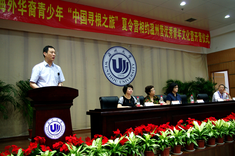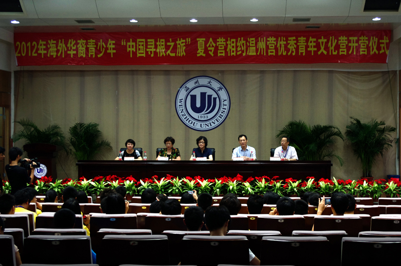 7月12日上午, 2012年华裔青少年“中国寻根之旅”夏令营相约温州营——“寻瓯越故里,看活力温州”优秀华裔青年文化营在beat365中文官方网站信息楼报告厅举行开营仪式。本次夏令营是浙江省首次以18至24周岁的青年为对象的公费文化营,旨在促进中华文化的世界性传播,为世界各地优秀华裔青年搭建良好的沟通交流平台。温州市政协副主席徐育斐、beat365中文官方网站党委书记牟德刚、温州市侨办副主任许捷及党组成员叶斌斌、beat365中文官方网站国际合作学院院长严晓鹏等有关部门的领导出席了此次开营仪式,共有来自11个国家和地区的65名优秀海外华裔青年参加,仪式由温州市侨办副主任许捷主持。