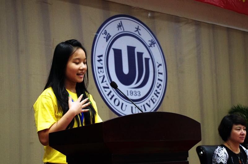 意大利卡拉曼得瑞学校的缪苗苗代表夏令营的青年营员发言。发言中,缪苗苗提到45万在外温州人为世界创造了巨大的物质和精神财富,并大声地说“我自豪,因为我是中国人,是中国温州人!”她的发言得到了在座所有海外华裔青年的强烈共鸣,赢得热烈掌声。
