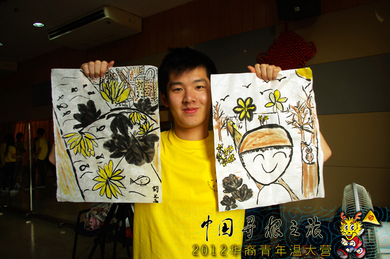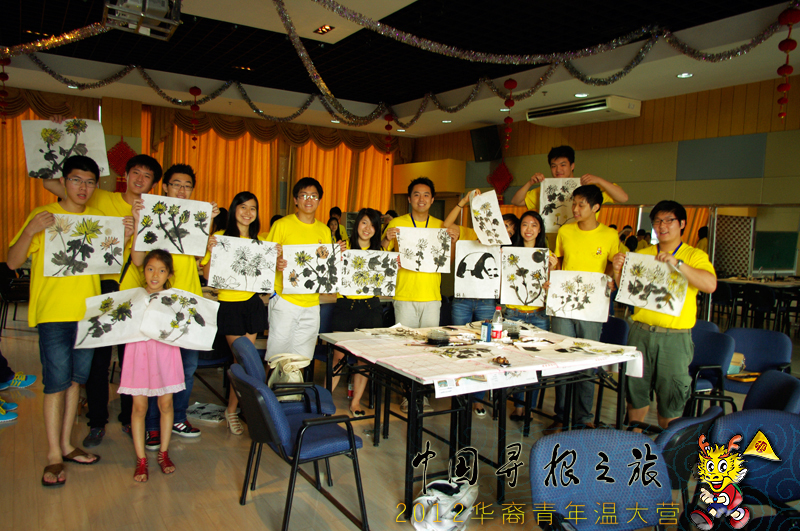 谢教授先为营员们播放了一段介绍国画的宣传片,让大家了解到中国水墨画的悠久历史和博大精深的艺术魅力。随后,谢教授为大家示范如何画菊花,摊开白宣,笔尖游走,多多菊花绽放宣纸之上。营员们发出声声赞叹,连连鼓掌。虽然很多海外华裔青少年从未接触过如何使用毛笔作画,用笔也很吃力,但是大家却一笔一画,毫不马虎。