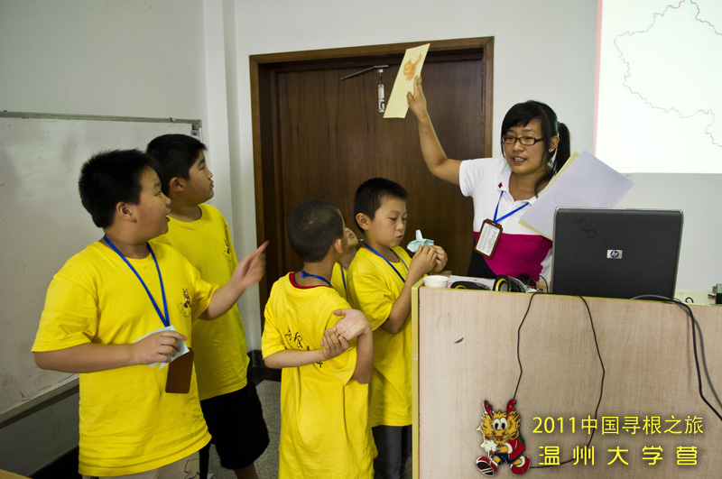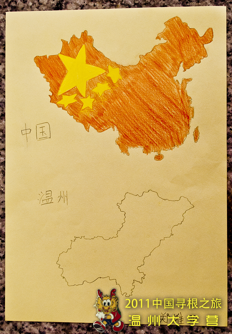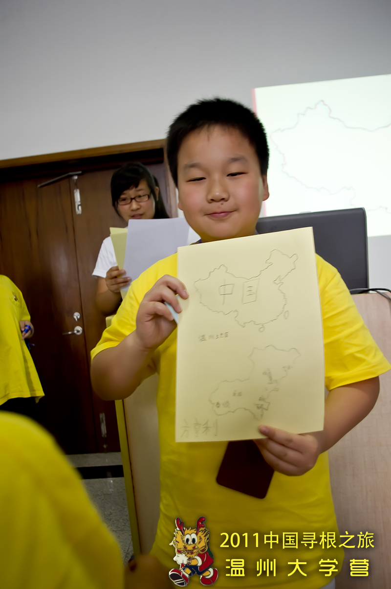 最后,任课老师还向大家讲解了关于温州的基本地理知识。老师还让营员们亲手画出一幅中国地图和温州地图,告诉大家:要永远铭记我们祖国,我们故乡的形状的样子!