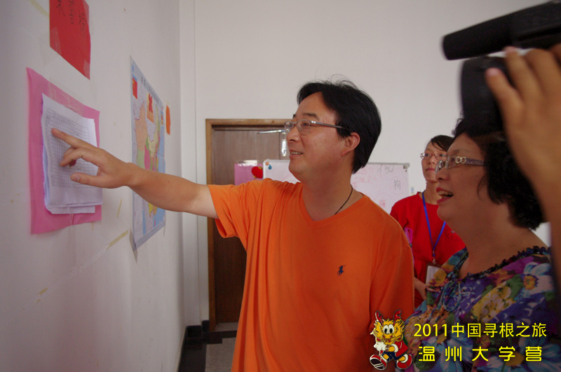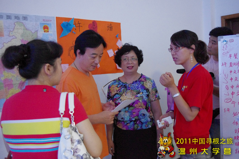 7月22日下午三点,温州市侨办主任鲍卫翔,副主任许捷,文宣处处长叶斌斌等领导来到2011海外华裔青少年“中国寻根之旅”温州营温大分营的营地,视察今年夏令营的各项工作。