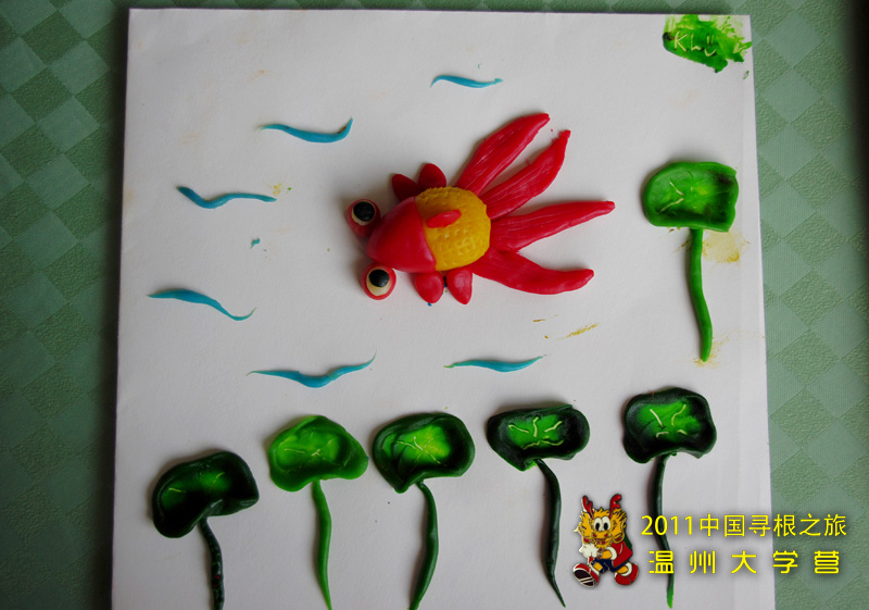本次米塑课,营地老师专门请来温州市华侨中学的米塑专家杜伟川老师为营员们演示米塑技艺。今天的米塑主题是:“荷下金鱼”,在老师的手上,长长的米粉变成了黄色、绿色、红色,蓝色。不一会儿的时间,一条栩栩如生的金鱼便游弋在白色的纸张上了,整个过程,营员们看得如痴如醉。