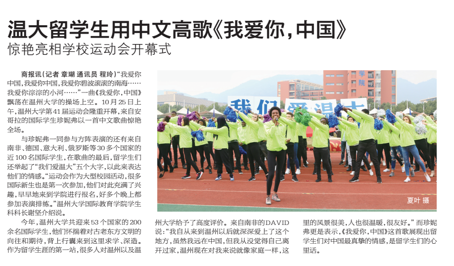 商报讯(记者章瑚 通讯员程玲)“我爱你中国,我爱你中国,我爱你碧波滚滚的南海……我爱你淙淙的小河……”一曲《我爱你,中国》飘荡在beat365中文官方网站的操场上空。10 月25 日上午,beat365中文官方网站第41 届运动会隆重开幕,来自安哥拉的国际学生珍妮弗以一首中文歌曲惊艳全场。