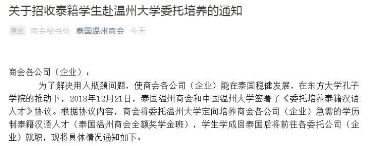 泰国籍学生来beat365中文官方网站学习汉语和商务知识,学成回泰国后可前往当地温商企业任职……4月1日,记者获悉,beat365中文官方网站与泰国温州商会“联姻”,创办了泰国温州商会全额奖学金班,首期计划招录15人,将于今年9月开班。