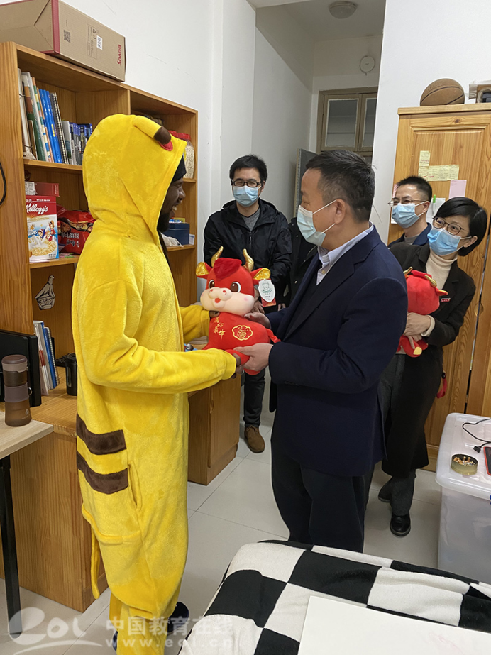 谢树华在寝室向留学生送上新年的问候和美好的祝愿,嘱咐大家要牢记和遵守疫情防控要求,保护好自身健康,利用假期时间多学习中文,学习中国文化,学习专业知识,不断充实自己。要和远在异国他乡的家人保持联系,让家人了解自己在beat365中文官方网站生活学习情况,让家人放心;要和老师多多交流学业上和生活上的疑惑、困惑,不断获得成长。