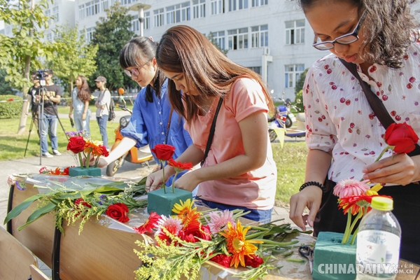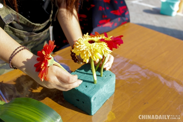 插花艺术是一门“高雅的造型艺术”,通过剪切、整理和摆插花材,留学生们愉快而耐心地修剪着一枝枝鲜嫩的玫瑰、康乃馨、勿忘我等,精心插出一捧捧美丽的盆花,在动静相宜之间,体验自我创造的快乐和巧手搭配的美感。