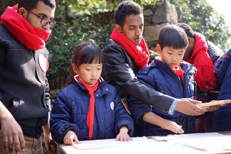 在七都樟里村,探寻乡村文化。在七都樟里村享用完土灶美食后,小使者牵起大朋友们的手,开始一对一教写中国字“新年好”。“每个汉字背后都藏着一个美丽的故事。”小使者们教得认真,留学生们也写得饶有兴致。虽然不太懂温州民谣《问姓谣》的意思,大朋友们还是唱得一个欢。