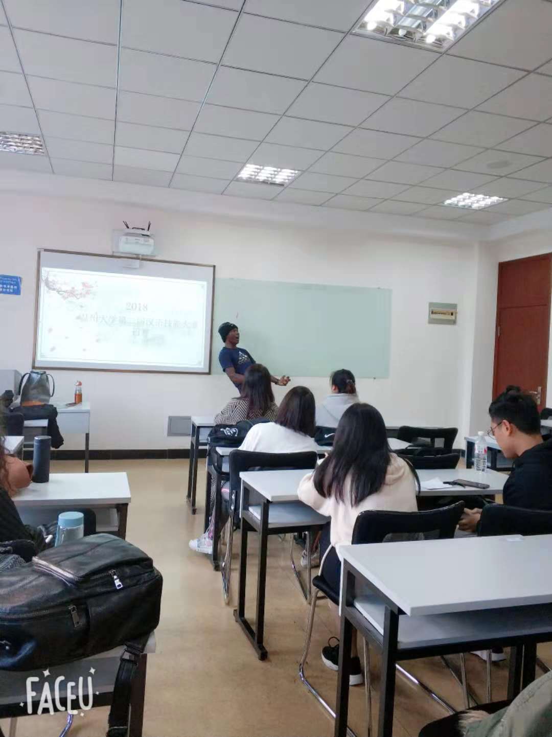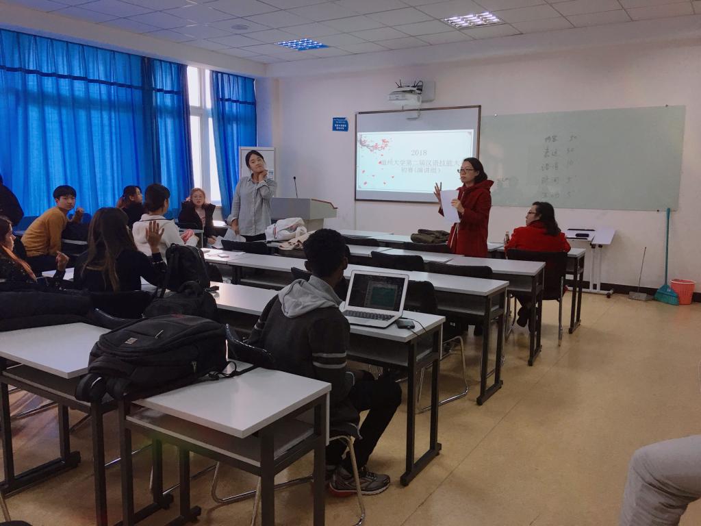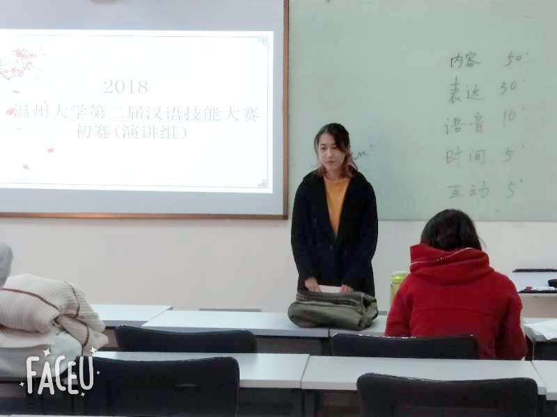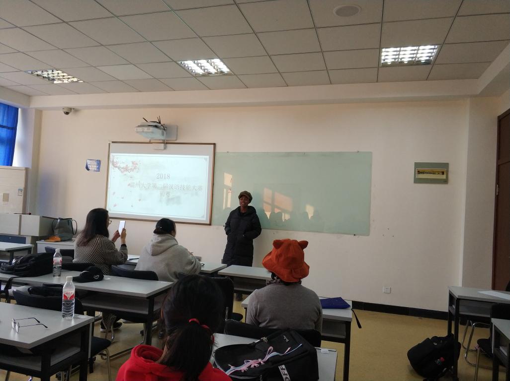 2018年11月26日下午3点半,我校第二届留学生汉语技能大赛初赛在beat365中文官方网站举办,来自韩国、泰国、喀麦隆、意大利、乌干达、埃塞俄比亚等多个国家的留学生参加了本次比赛。本次比赛涵盖演讲、歌唱、朗诵三个类别,分别在不同的教室同时进行。为了确保本次大赛评比的公开、公平、公正性,本次比赛邀请了六位老师作为此次比赛的评委。其中郑婷和金碧两位老师为演讲组的评委,阚文文和徐丽丽两位老师为朗诵组的评委,包含丽和张珉璐两位老师为歌唱组的评委。在比赛开始之前,各位老师首先向学生细致讲解了本次比赛的基本要求和打分细则,并通过抽签的形式确定参赛选手的顺序。