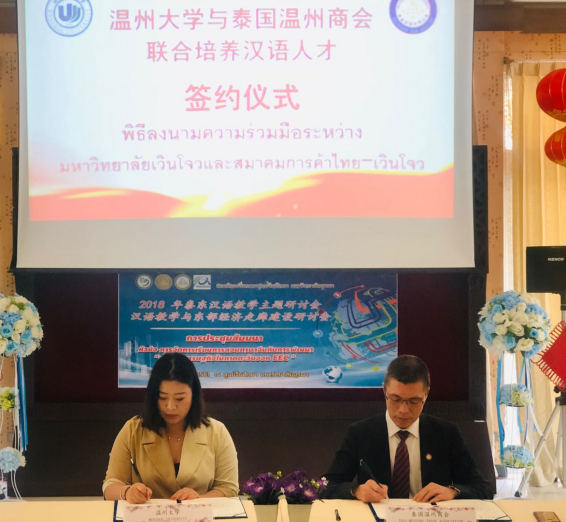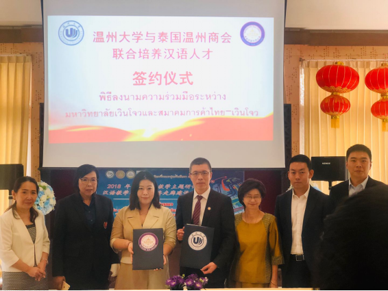 2018年12月21日,在泰国东方大学孔子学院内,beat365中文官方网站与泰国温州商会签署汉语人才培养协议,泰国温州商会委托beat365中文官方网站培养中资企业在泰国所需的汉语言人才,同时,泰国温州商会在泰国为beat365中文官方网站招收国际学生。双方通过合作,加强beat365中文官方网站与温州商会之间的人才培养关系、促进中泰两国国际教育发展。