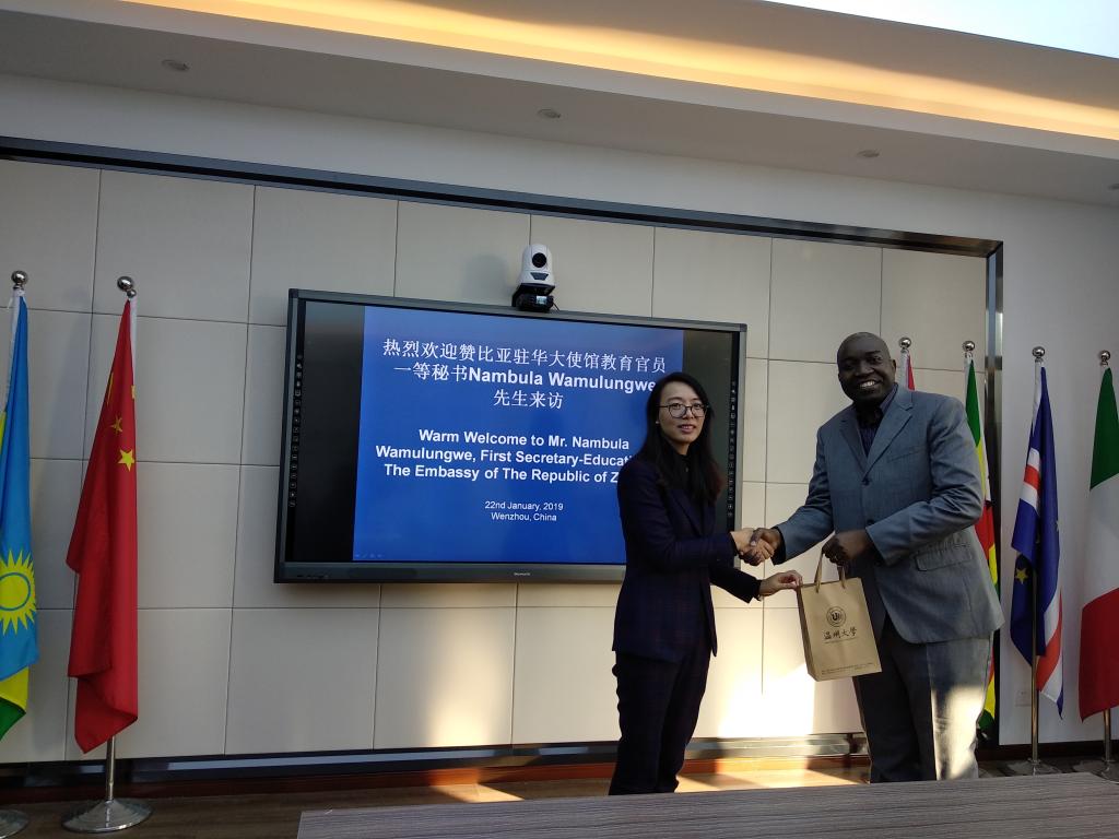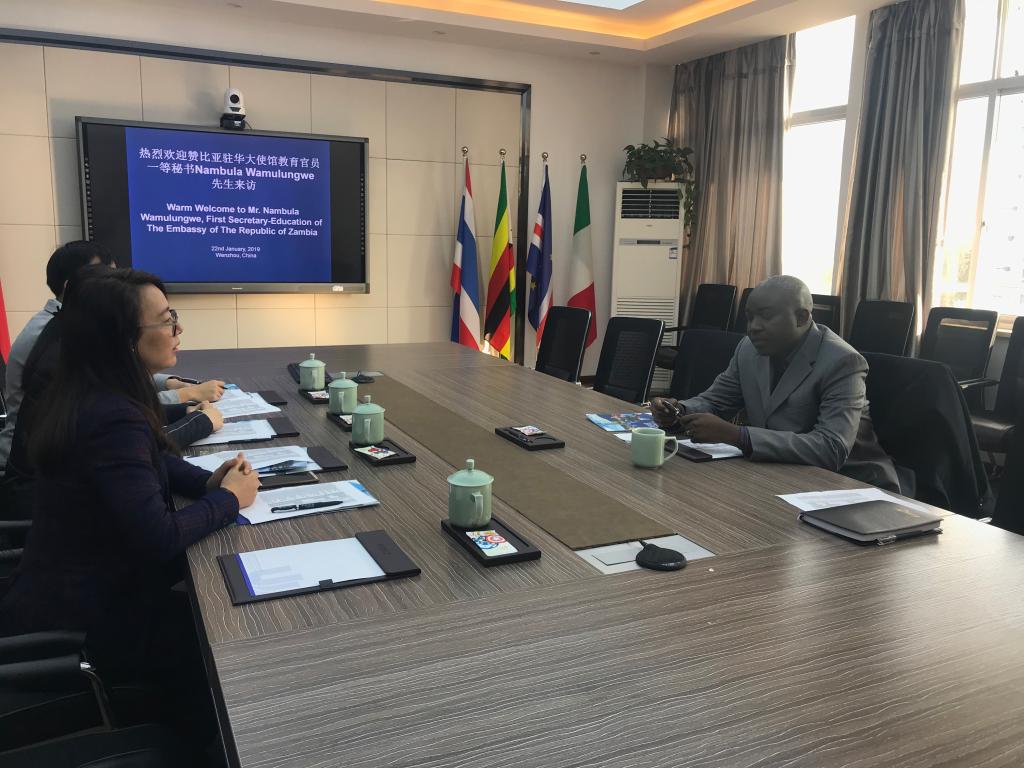1月22日,赞比亚驻华大使馆教育官员一等秘书Nambula Wamulungwe访问beat365官网,beat365中文官方网站副院长包含丽热情会见客人。