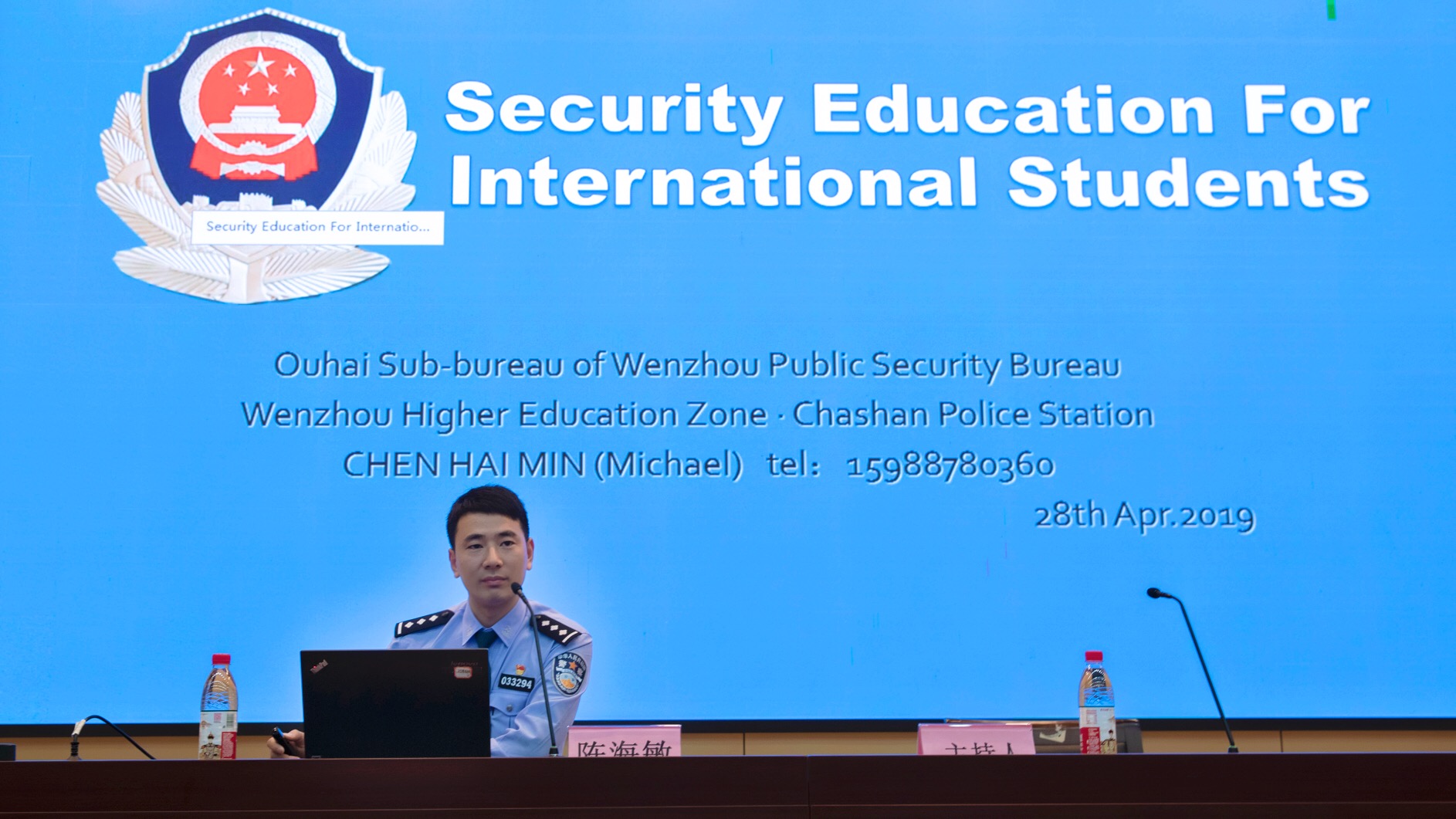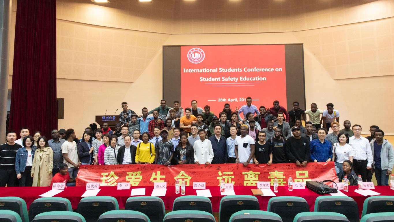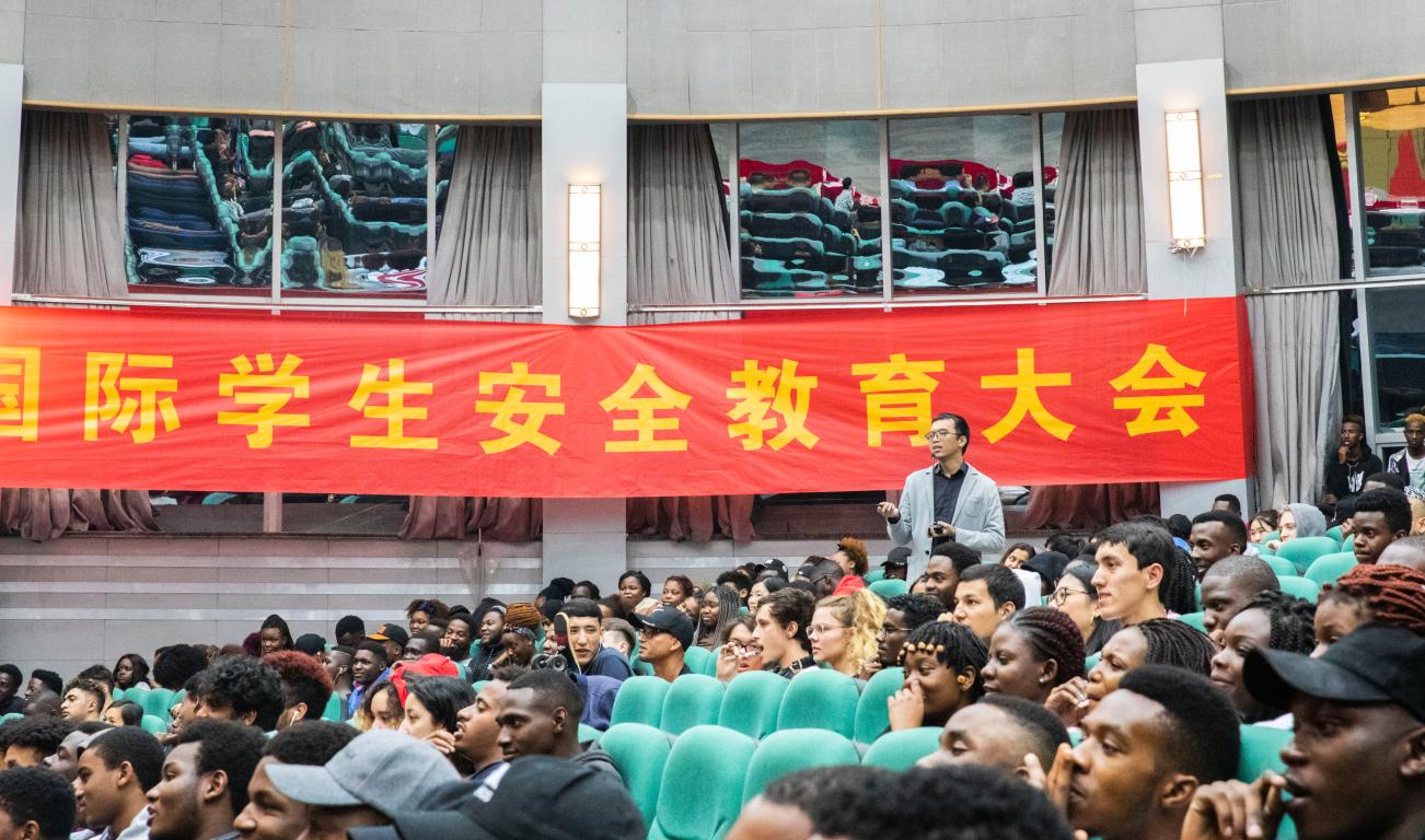 为了做好中国法律法规和校纪校规的宣传,将法律法规教育贯穿国际学生培养全过程,提高国际学生的法律法规意识,4月28日,我校在南校区9号楼一楼报告厅召开全体国际学生安全教育大会。党委委员、副校长钱强,茶山派出所副所长黄龙武、警官陈海敏,校保卫处处长孙安梭,后勤集团公司副总经理张雪萍,国际学院(留管部)院长兼党总支书记、主任叶苗,商学院党总支副书记刘开练、法政学院副院长缪心毫、数电学院副院长朱翔鸥、生环学院副院长陈华林、机电学院党总支副书记李密,专业学院国际部主任、专员、班主任、辅导员以及600多名国际学生参会。会议由国际学院党总支副书记陈文远主持。