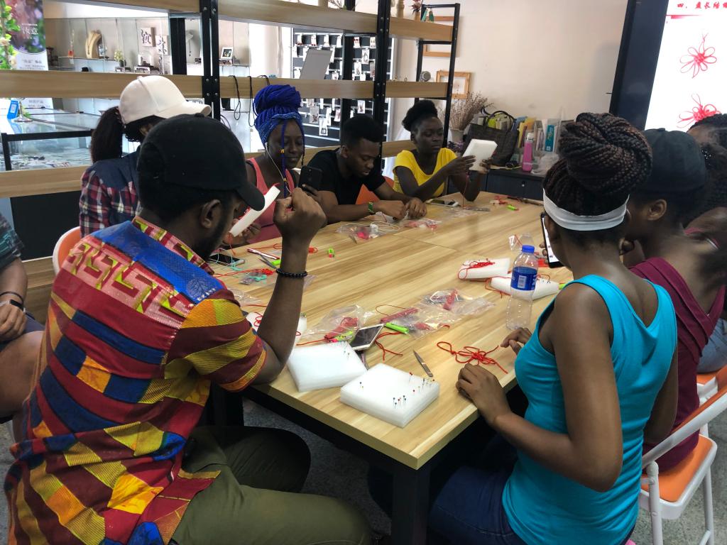 活动伊始,汝意饰品工作室的魏静教授向大家介绍了中国结的来源、发展和美好意蕴。接着,魏老师指导留学生们制作简易的盘长结。魏老师详细讲解了盘长结的制作步骤,并不时走下讲台帮助学生进行调整。在主体部分做好后,又指导留学生们穿上珠子、流苏等饰件。学生们专注听讲,虚心请教。历时近两个小时,留学生终于制作完成了中国结,他们兴奋地举着中国结拍照,来自津巴布韦的留学生Ahemed感叹:“做好中国结真不容易,我一定会带着它回国!”来自南非的学生感叹:“小小的中国结里,包含着团结、幸福、平安的意义。我会好好珍藏自己亲手做的中国结,纪念我的中国时光。”