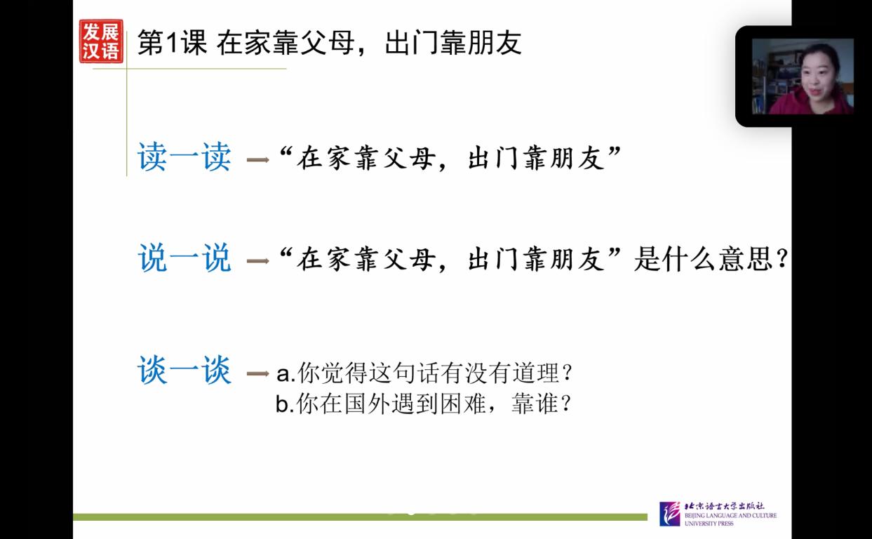beat365官网语言生主要来自英国、泰国、尼日尼亚,韩国、意大利等国家,根据学生起始汉语水平分为A2班、B1班、B2班、C2班4个班级。因地域跨度大时差问题特别突出,经过各班主任和学生的沟通,每个班级的时间又进行了重新调整。为方便学生,有的教师甚至牺牲自己休息时间,把课程安排到了晚上。对于实在无法跟班上课的学生,老师们采用录课的形式,发给学生自主学习。