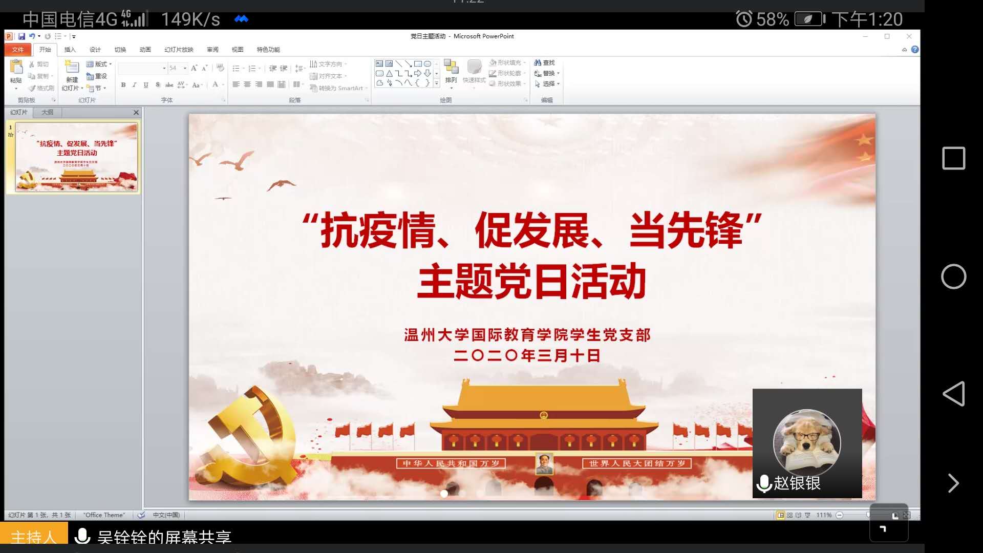 疫情之下,虽难以像往常一样面对面开展党日活动,但beat365官网学生党支部也积极创新,采用线上视频会议形式开展了新学期的主题党日活动。支部全体学生党日如期参加活动,由学生党支部书记吴铨铨主持。