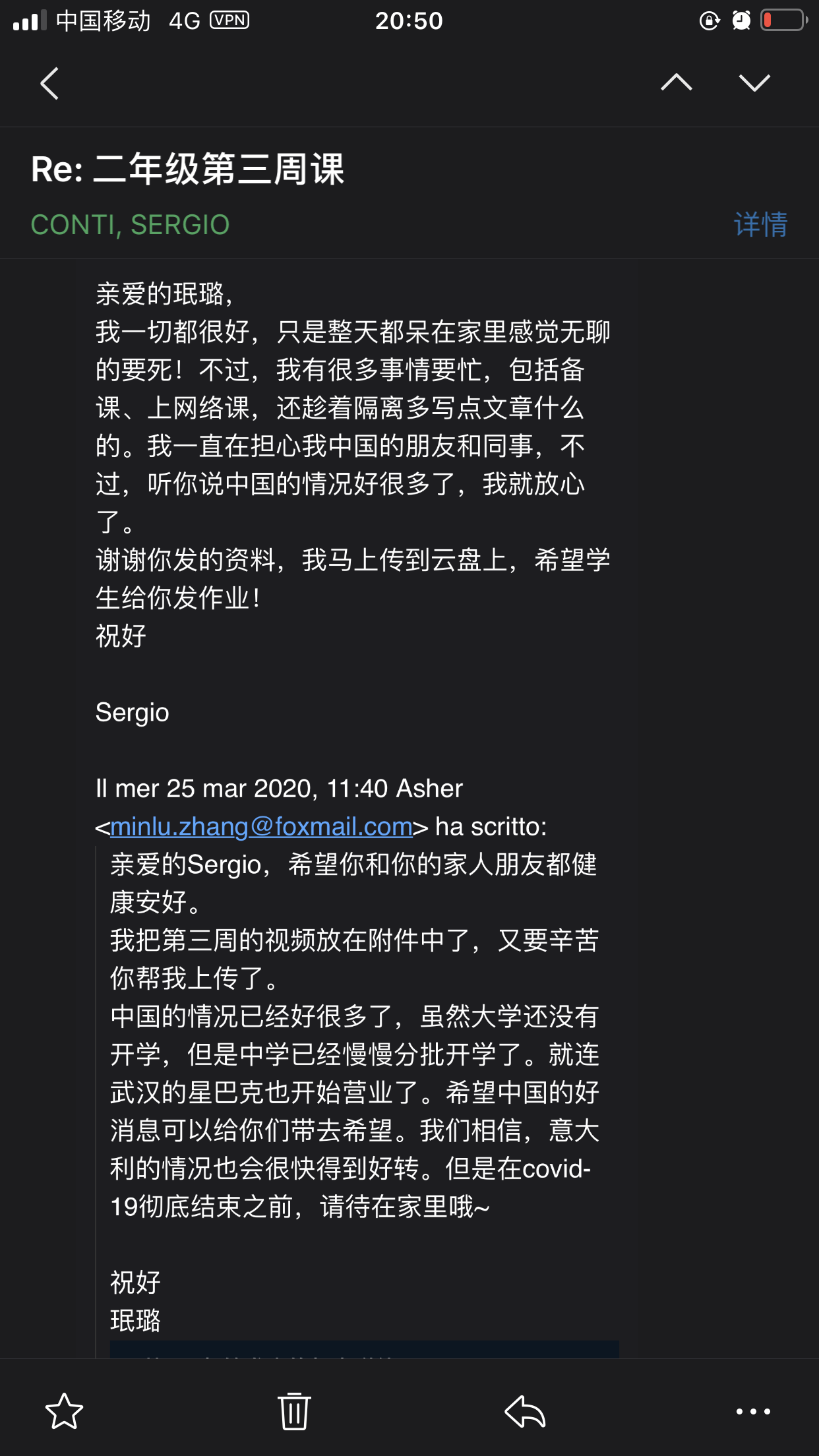 “刚回温州的时候,正是温州疫情最严重的时候。虽然远隔千山万水,意大利学生和同事时时刻刻通过网络关注中国疫情和温州疫情,几乎天天给我发来短信,询问和关心我的生活起居,这些跨越山水、跨越国界的关爱给了居家隔离的我诸多安慰。”