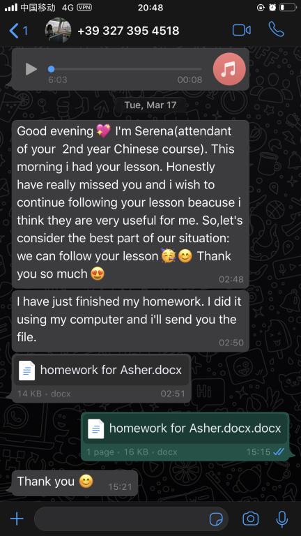 每一周,张珉璐都会精心把每个年级的两小时课程视频录制好,与音频、ppt、练习作业及一些额外的针对不同级别HSK的练习发送给意大利老师,意大利老师再上传至beat365中文官方网站意大利分校的学习平台,学生通过平台下载视频和学习资料进行学习。