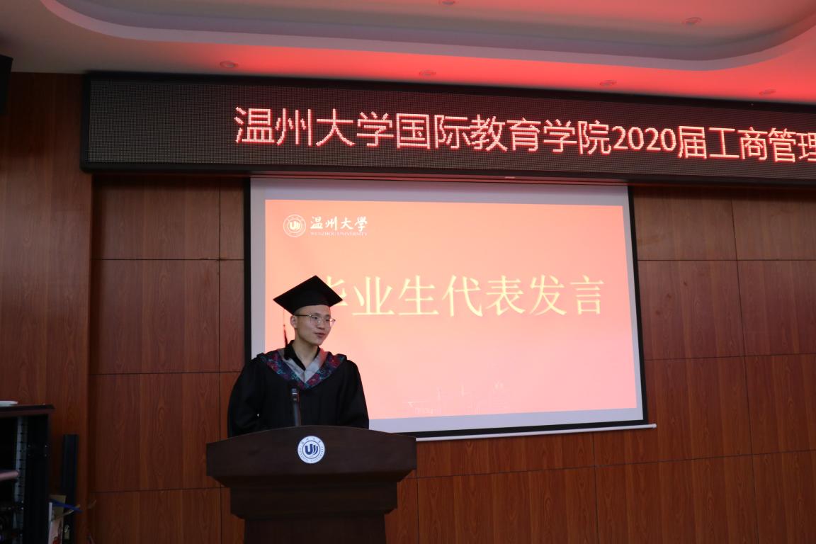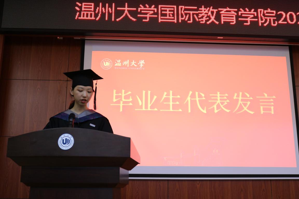 毕业生代表吕杨楠表达了对学院四年来的培养的感谢,同时表示将不负学院嘱托,开拓进取。费志能同学回忆了在国际学院的点点滴滴,表达了对离开学院的不舍。临行前呼吁广大毕业生紧随时代步伐,勇往直前,为美好的明天努力奋斗。