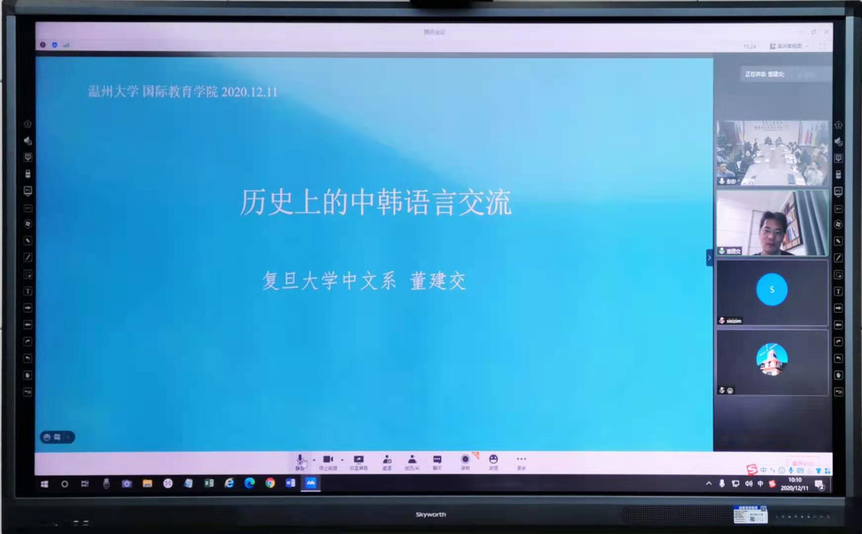 2020年12月11日上午10:00,复旦大学中文系董建交教授通过腾讯会议给我们带来了题为《历史上的中韩语言交流》的线上讲座。beat365中文官方网站叶苗院长、林爱菊书记、吴之欧副院长,部分专任教师及2020级汉语国际教育专硕点全体学生参加了这场讲座。讲座由专任教师叶晓锋博士主持。