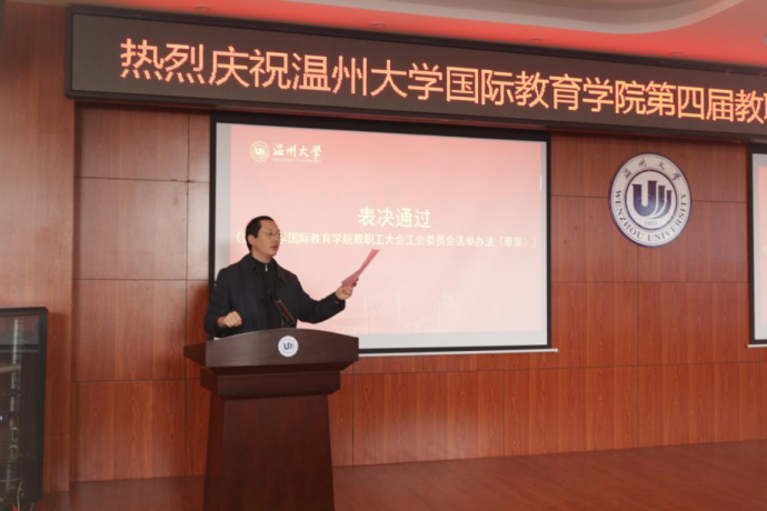 会议在庄严的国歌声中拉开序幕。首先学院院长叶苗作《学院工作报告》、《学院年度财务决算报告》,分别从工作回顾、存在问题及今后发展目标与主要任务等方面进行报告。叶苗院长指出,学院在疫情防控、规范国际学生工作,人才队伍建设、党建引领等方面取得了一定成绩,但仍存在一些问题,未来要继续坚守初心,勇担使命,推动国际化教育跨越式发展,谋取学院发展新高地。学院工会主席林爱菊作《工会工作报告》。