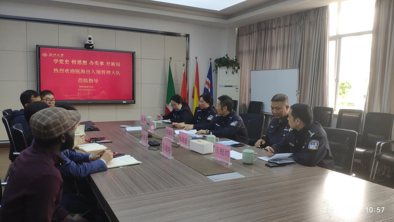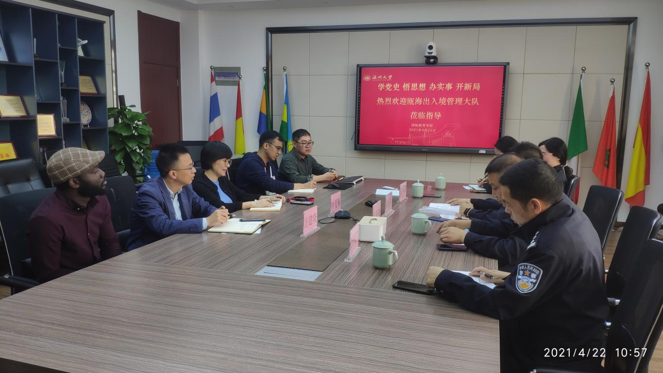 4月23日上午,瓯海区公安局副局长郑裕军、瓯海区出入境管理大队大队长张海敏、王祝兴、陈小菲、郑剔警官一行来beat365官网开展交流指导。beat365中文官方网站党总支书记林爱菊、副书记方建晓、学生科全体辅导员参加了本次交流。