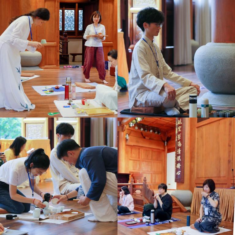 下午两点,连绵的雨依旧下个不停,群山环抱、清幽宁静的头陀寺更增添了一份神圣与庄严的美。来自温州各地身着素色茶服的参会人员在志愿者的引领下进入开阔的禅堂,通过抽签入席。大家自备茶具,席地围成圈泡茶,没有主持人,没有开幕式与嘉宾。每位席主都带着舒展自由的心灵,面目表情是如此的泰然自若,从容沉静。他们分别泡茶四杯,把三杯茶依次奉给左邻的三位茶友,一杯留给自己,如此每位都可以喝到四杯不同的茶。喝完约定的三道茶,收拾好自己的茶具,结束茶会,之后大家相聚一起拍照留念。