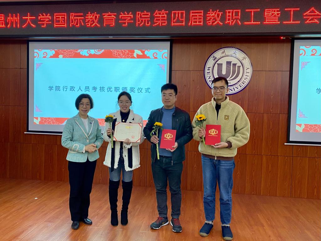 会议举行了二个奖项的颁奖。获beat365中文官方网站2021年度“院长特别奖”的为汉语国际教育专硕建设团队;获学院行政人员2021年度考核前三名为李舒琦、吴铨铨、钱江潮。