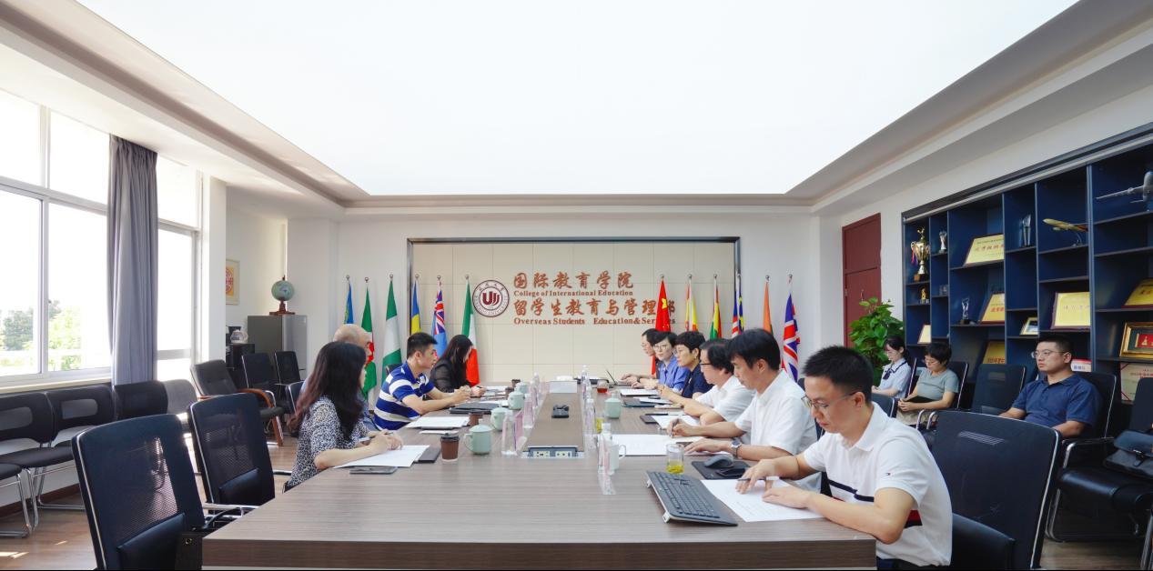 9月23日上午,浙江省教育厅国际合作与交流处调研员杜健、浙江工商大学beat365中文官方网站院长姜波、浙江理工大学beat365中文官方网站主持工作副院长陈敏之、浙江工业大学国际学院副院长蔡彬彬一行四人赴我校开展外国来华留学生教育管理工作专题调研。beat365中文官方网站副校长蔡曙光、国际交流与合作处处长黄文浩、beat365中文官方网站院长宋占美、党总支书记林爱菊、副院长熊勇、副书记方建晓及各科室科长参加调研座谈会。