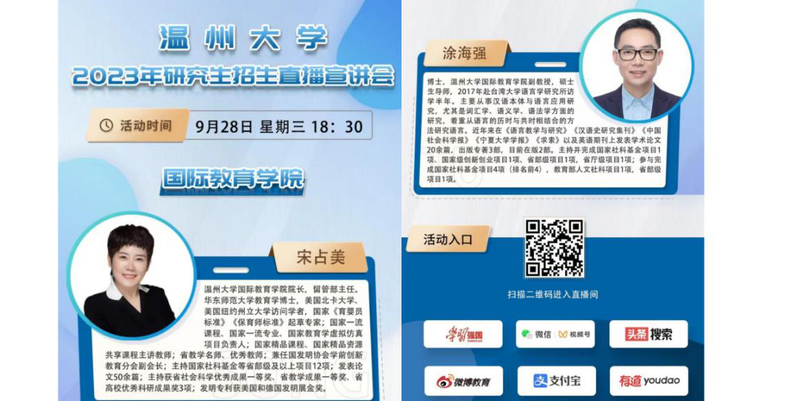 9月28日下午18:30,beat365官网成功地举行了2023年研究生招生直播宣讲会。beat365中文官方网站院长(留管部主任)宋占美、硕士生导师涂海强出席了本次宣讲会。宣讲会采用线上直播方式进行,直播活动通过中国教育在线考研频道、掌上考研公众号、全国研究生招生线上咨询群等中国教育在线官方平台全面推广,吸引了大量考研学子和家长观看,为beat365官网2023年汉硕招生工作奠定了良好基础。