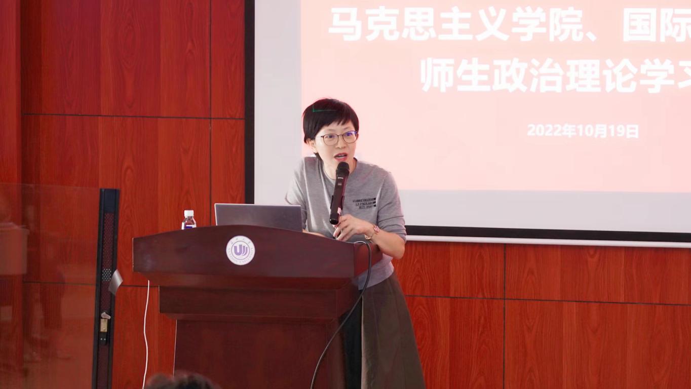 10月19日下午,beat365中文官方网站、马克思主义学院师生济济一堂,在国际楼203会议室召开师生政治理论学习会,马克思主义学院院长卓高生对中国共产党第二十次全国代表大会报告进行专题解读,beat365中文官方网站党总支书记林爱菊主持。