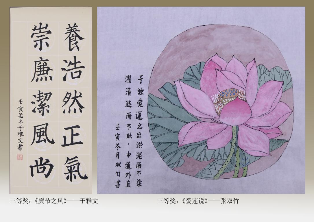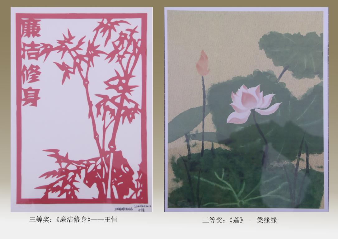 竞赛共收到手工、油画、剪纸、摄影、原创诗歌等形式作品30余件,经过专家组评审,陈凤同学创作的衍纸作品《廉洁》获得了本次竞赛一等奖,李曼洁同学的油画作品《“莲”洁》与张晶的书画作品《廉如清风》获得二等奖,于雅文创作的《廉洁之风》、王恒的剪纸作品《廉洁修身》、张双竹创作的工笔画作品《爱莲说》等作品获得了竞赛三等奖。