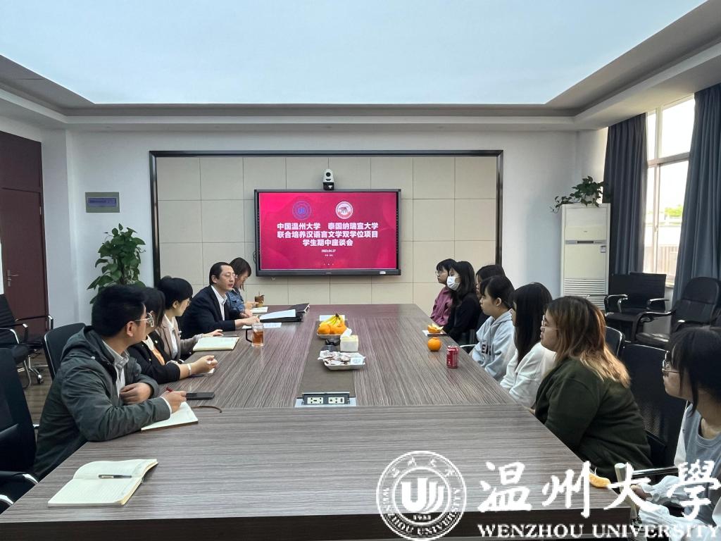 为进一步了解beat365中文官方网站与泰国纳瑞宣大学联合培养汉语言文学专业学生学习生活情况,畅通师生沟通渠道,倾听学生心声,beat365中文官方网站于4月27日上午在3-311会议室召开beat365中文官方网站泰国纳瑞宣大学联合培养学生期中座谈会。学院党总支书记林爱菊、副院长熊勇、班主任张珉璐、招生科、学工办相关教师及7名项目学生参加会议。