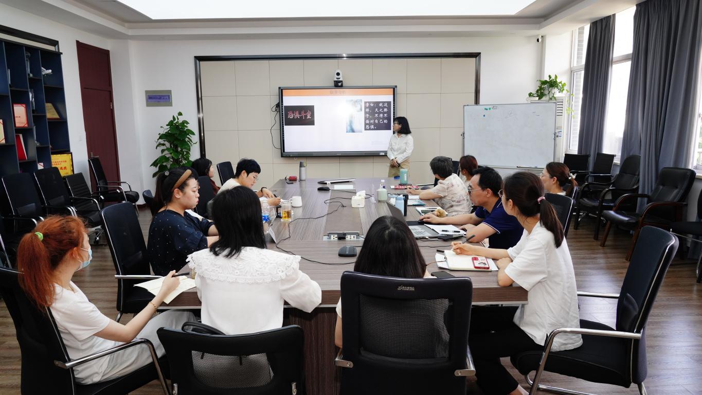 会议开始,金碧老师进行了《广告》的教学课堂展示。她从话语分析的视角,结合一则典型的广告视频对广告进行了解析。展示结束后,在场的专任教师各抒己见,对金碧老师的课堂展示进行点评,互相探讨更好的教学开展方式。