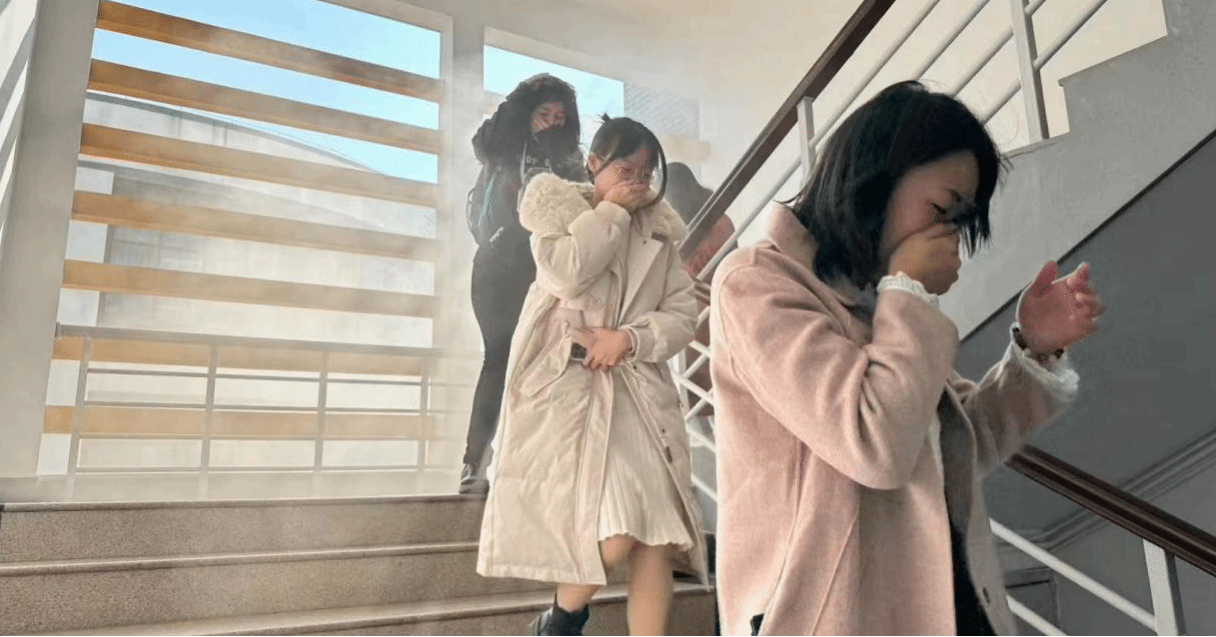 随着警报声响起,消防演练正式开始。大家立即停下手中的工作和学习,按照平时演练的步骤和路线,沿着逃生通道迅速而有序地撤离。在逃生过程中,师生们捂住口鼻,沿着墙角弯腰快步前进,安全有序地撤离到指定区域。整个过程紧张而有序,没有出现慌乱和拥挤的情况。