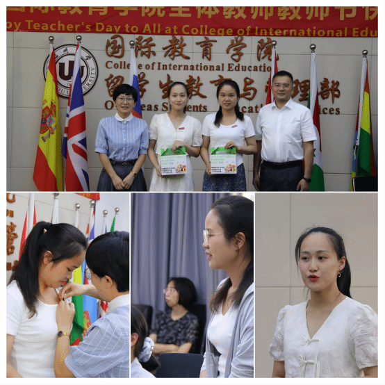 随后,会议举行新入职教工欢迎仪式。彭水琴和周莹瑶两位老师逐一进行自我介绍,受到了全院教师的热烈欢迎。林爱菊书记为两位教师佩戴上校徽,夏远志院长为他们送上了教师节礼物。