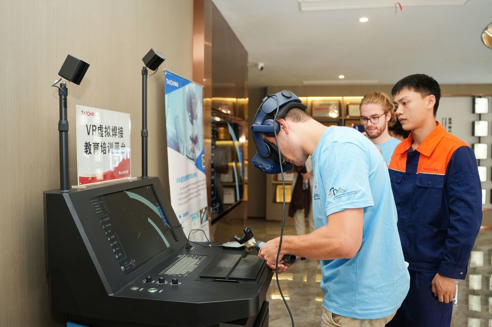 行程首站是泰昌集团,这家立足输变电产业的公司,向学生们展示了创业精神和科技实力。学生们参观了行知馆、泰行书斋等场所,了解泰昌集团的创业和发展故事。在温州市焊接高技能人才公共实训基地,学生们通过VR虛拟焊接教育培训平台沉浸式学习和体验焊接技术。随后,学生们参与了中外青年交流座谈会。会上,董事长张鹏飞做了“行之泰”的主旨演讲,分享了他的经营理念和对企业愿景的理解。在场学生纷纷提问,对企业产品、目标市场、市场份额、创业经验、企业家精神等方面展开探讨。此外,双方在愉快的氛围中分享了各自国家的文化和发展经验。