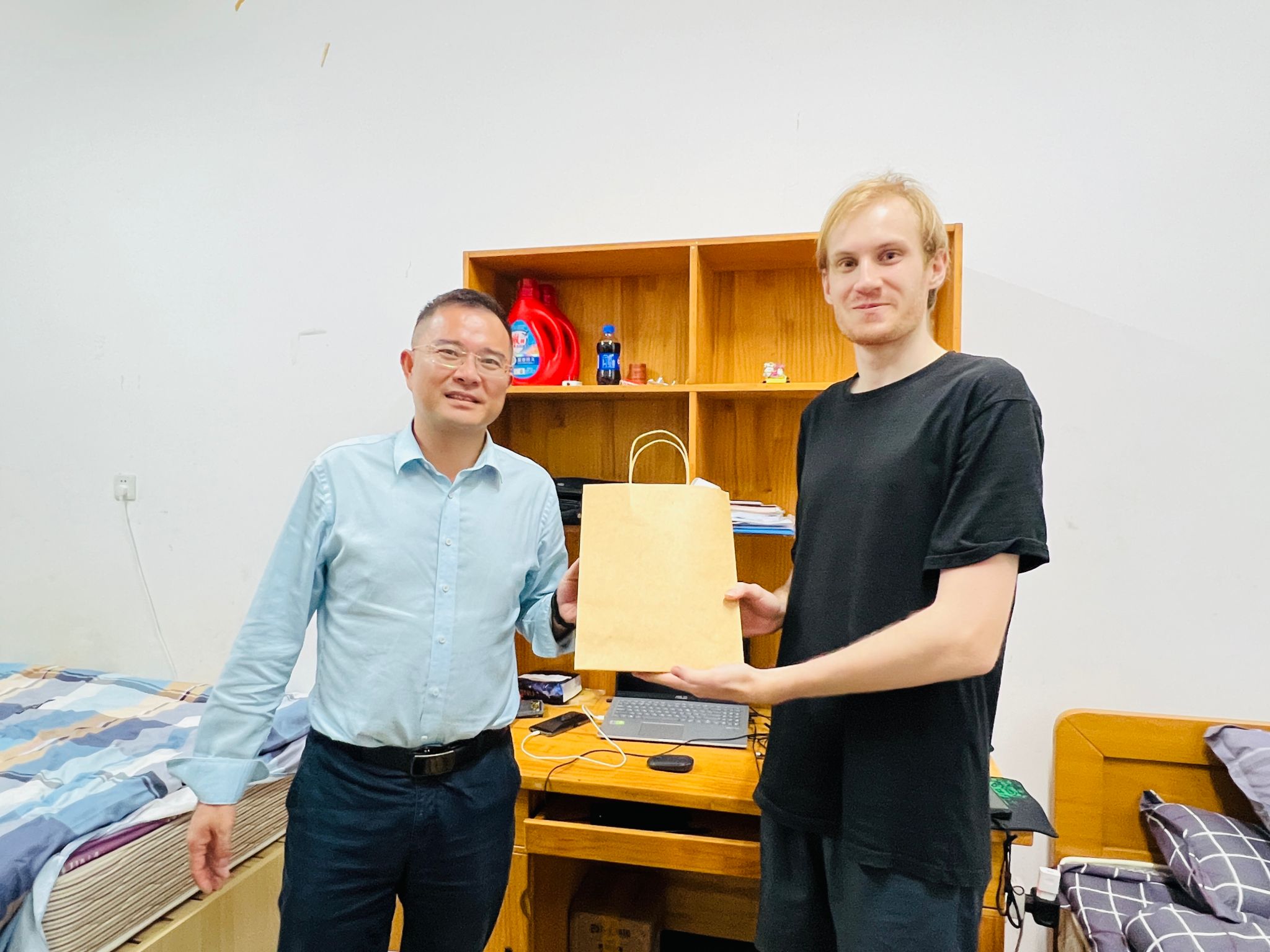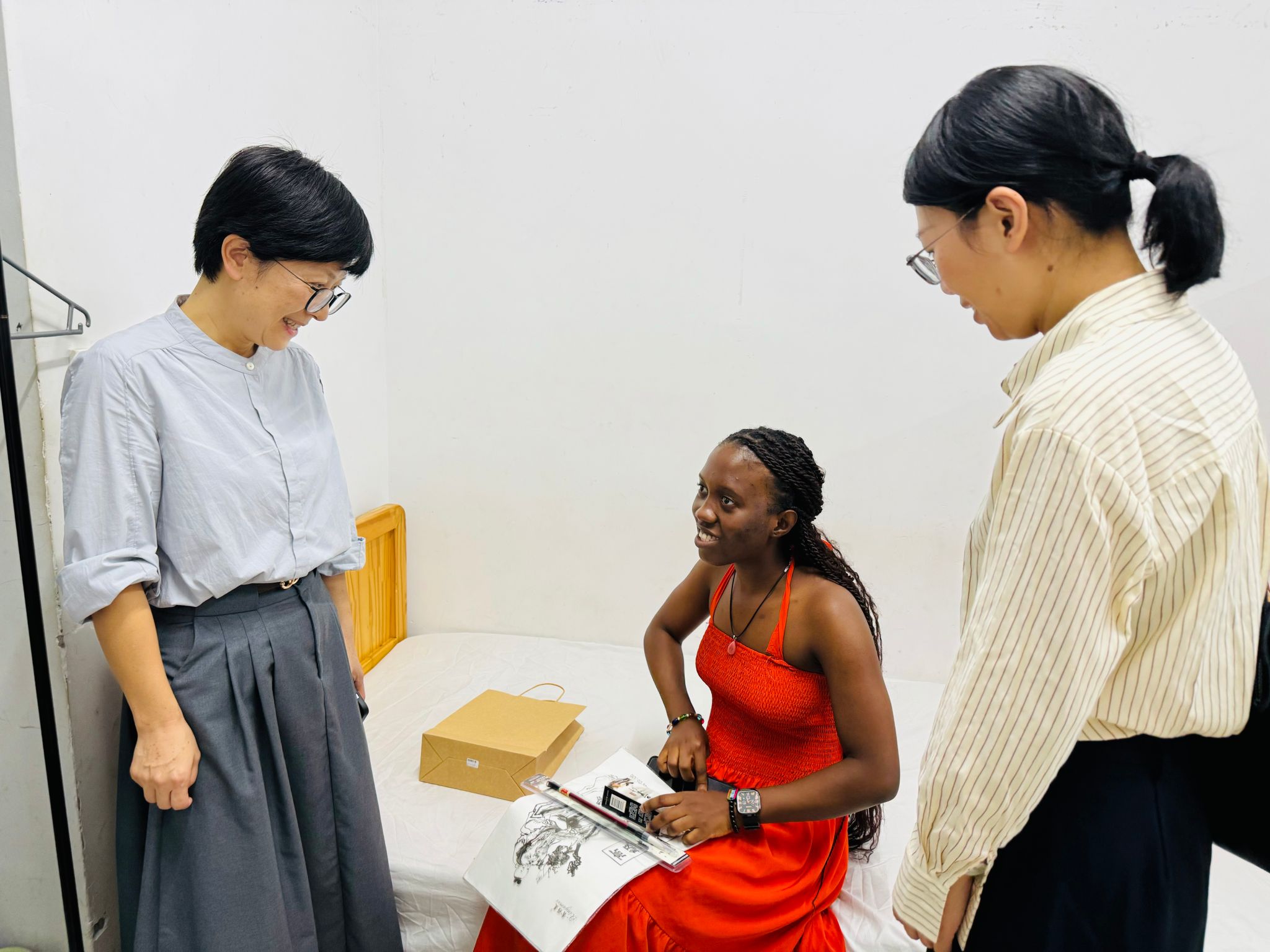 走访过程中,夏远志一行与新生们亲切交谈,仔细询问他们来到新环境后的感受,是否适应学校的生活节奏以及在学习和生活中遇到的困难,并叮嘱同学们要注意宿舍安全,保持良好的卫生习惯,共同营造一个和谐、温馨的生活环境。随后,学院领导们还为新生们送上了学院精心准备的“文房四宝”小礼包,希望新生们能以此为媒,切实感受中国文化魅力,在学习生活中不断成长进步。新生们纷纷表示,虽然初来乍到,但已经感受到了学院的热情和关怀,对未来的学习生活充满期待。